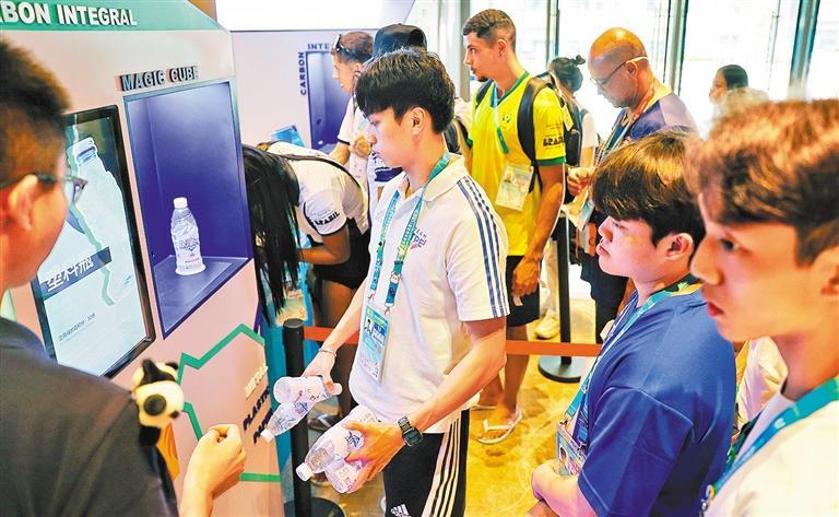 成都大运会大运村内的“低碳魔方”互动装置前,运动员将喝完的矿泉水瓶、易拉罐等废弃物品投入其中,机器即可生成碳积分小票,凭小票可兑换相应的礼品。