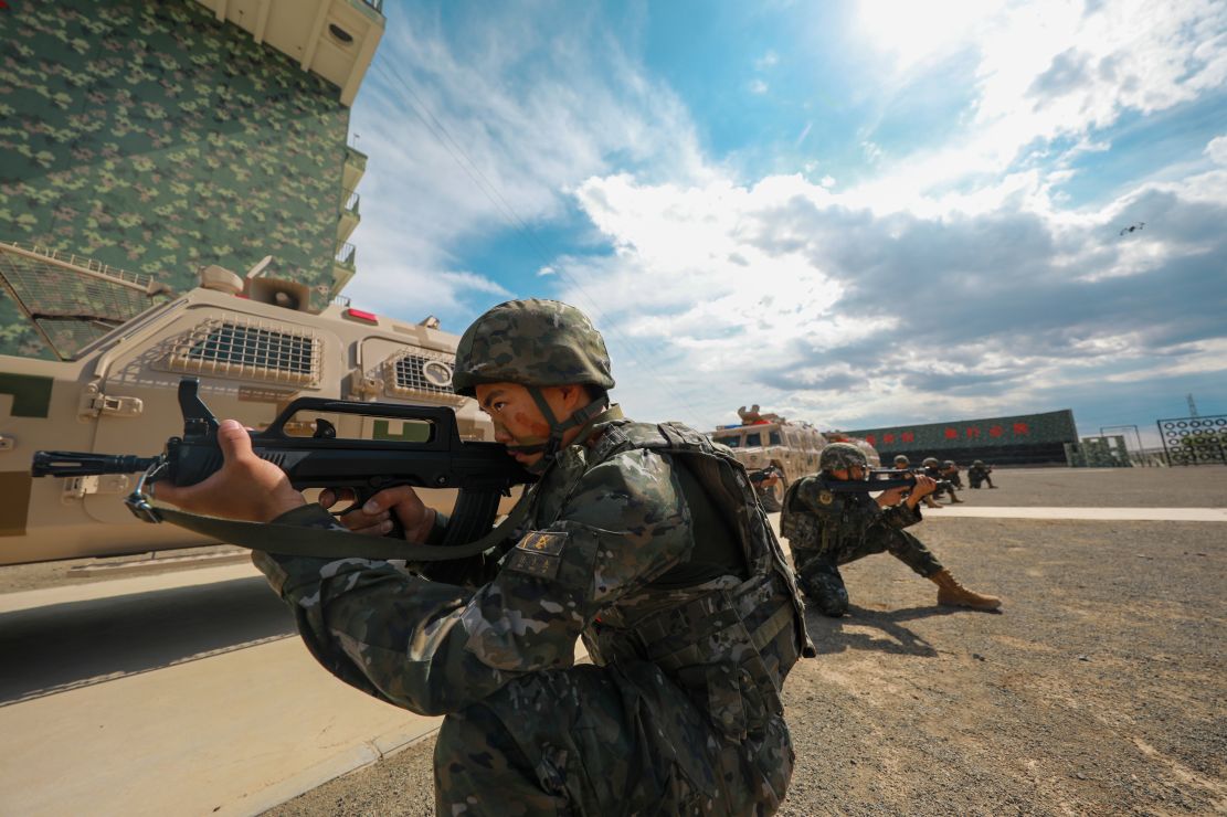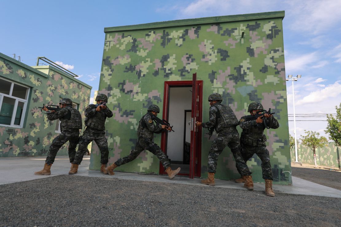 “注意隐蔽!”战斗小组接近“暴恐分子”占领的废弃楼房时,一枚燃烧弹突然破窗而出,队员立即相互掩护。随后,特战队员利用“敌方”的观察死角隐蔽接近,占领攻击位置。接到命令后,战车轰鸣,硝烟弥漫。狙击、侦察、突击等战斗小组兵分多路、密切协同,在侦察分队引导下,特战队员从不同方向迅速突入目标房屋,将“暴恐分子”全数击毙,成功解救“人质”。