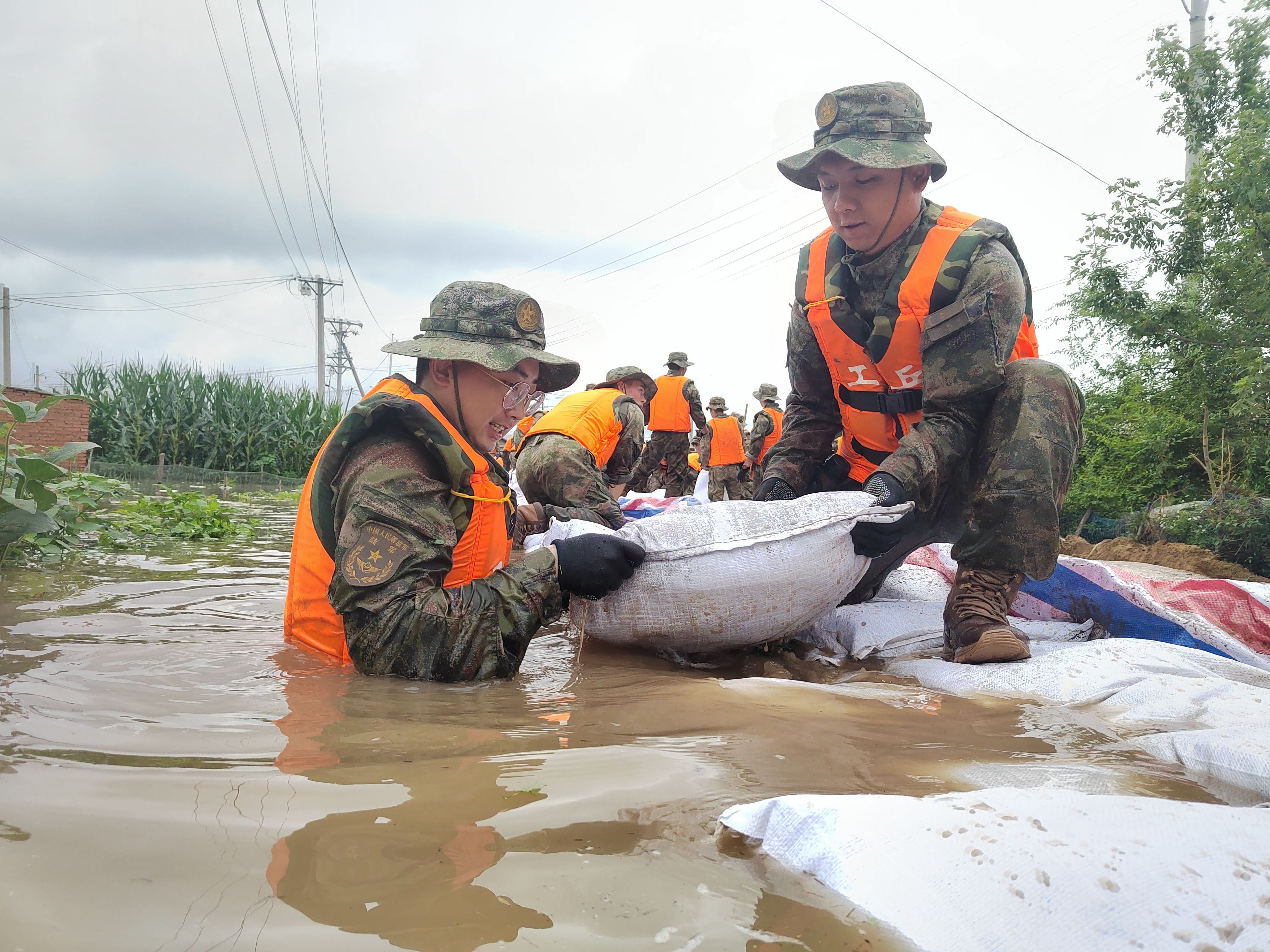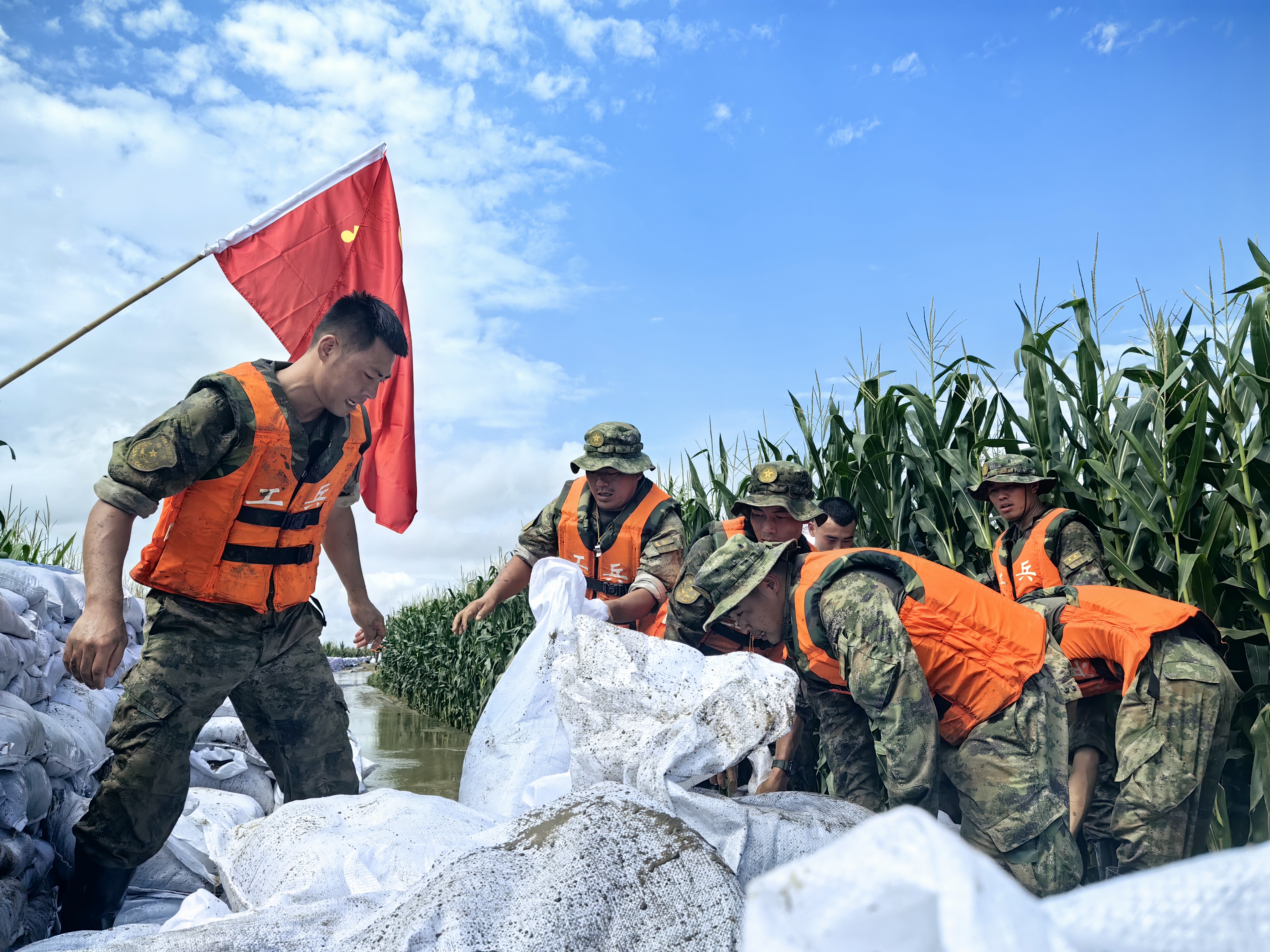 8月8日,第78集团军某旅官兵在黑龙江省哈尔滨市双城区修筑堤坝。 铁彦男 摄