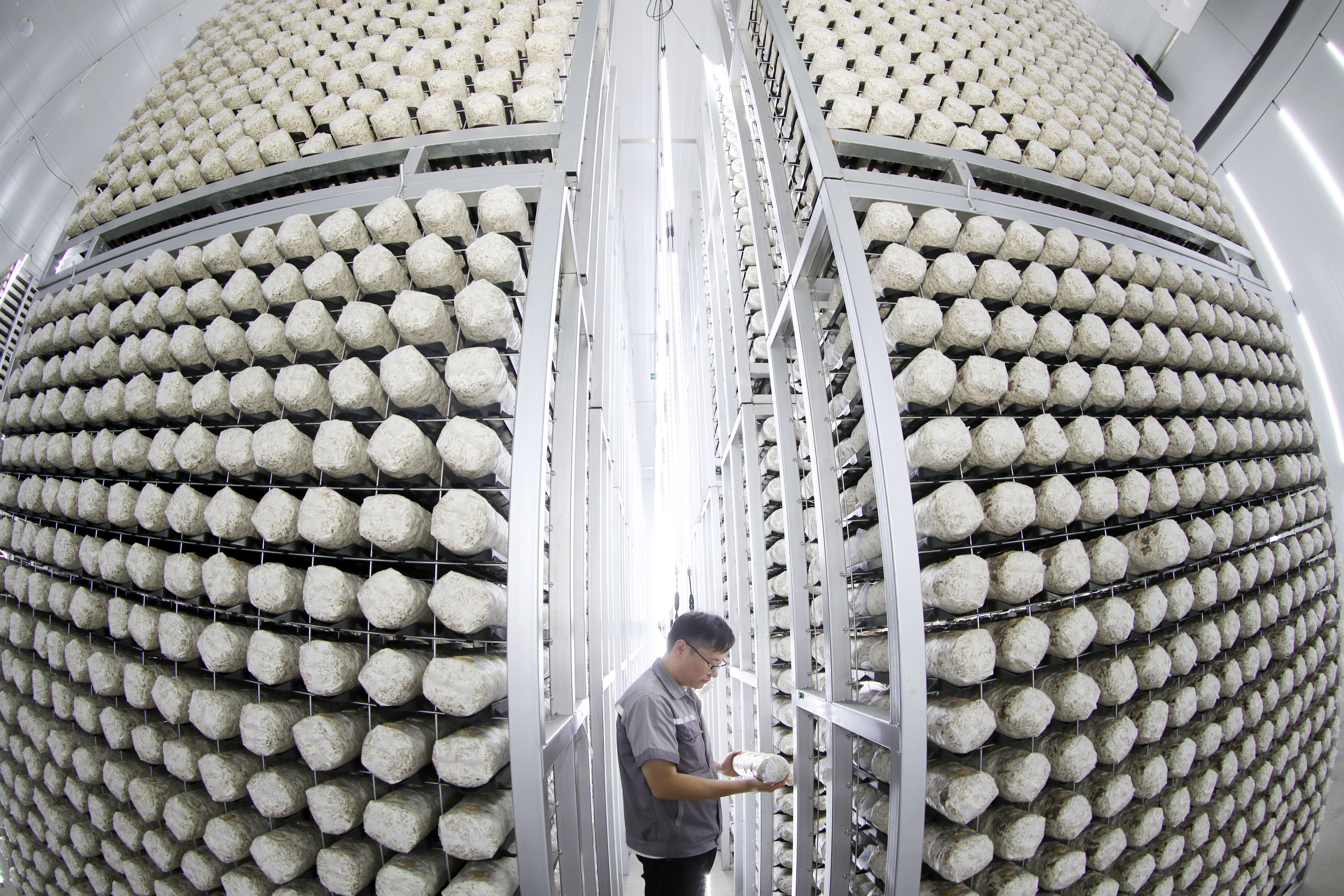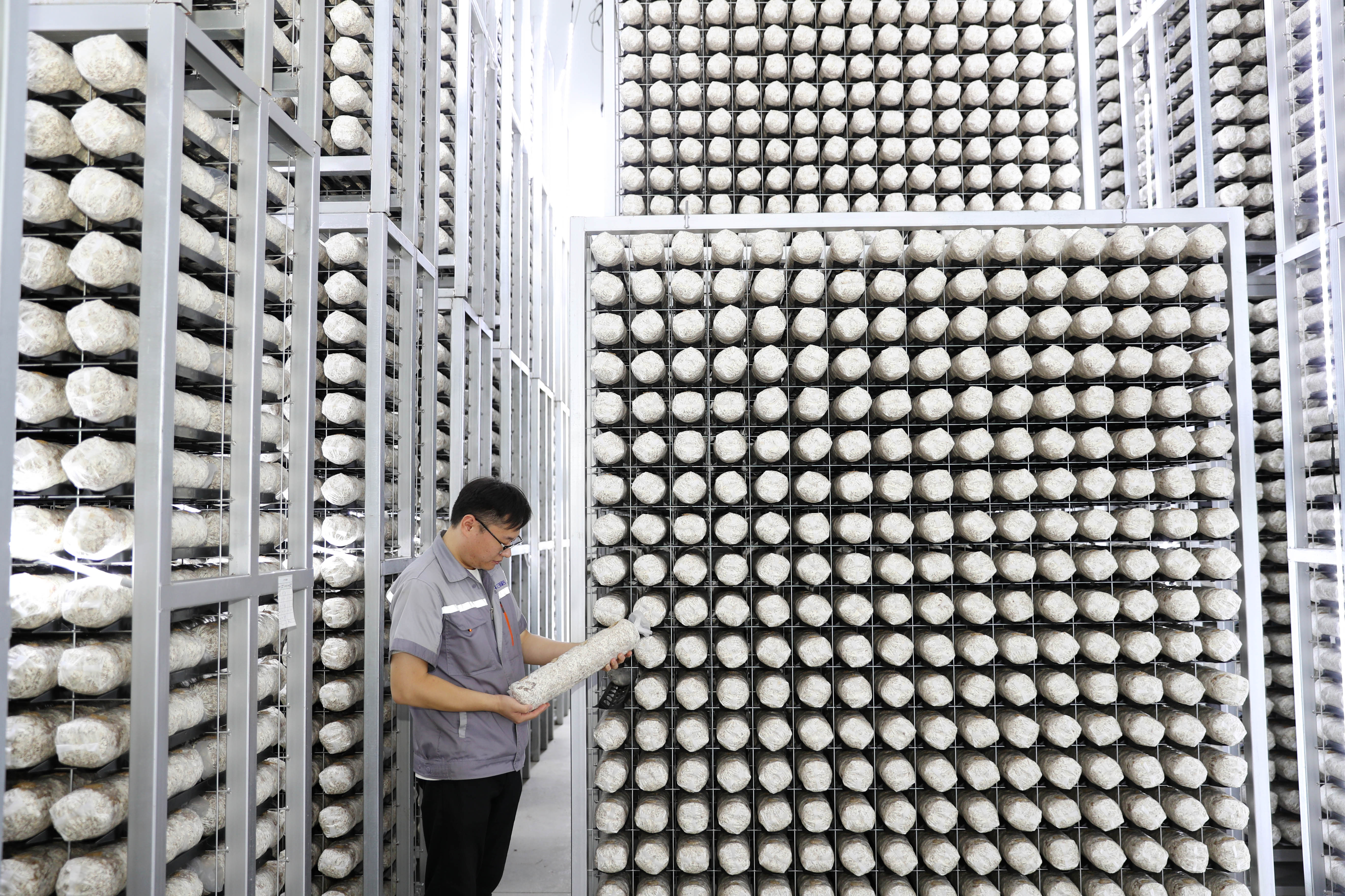 8月13日,青岛莱西市一家菌菇培育加工企业的工作人员在检查菌棒的生长状态。张进刚摄