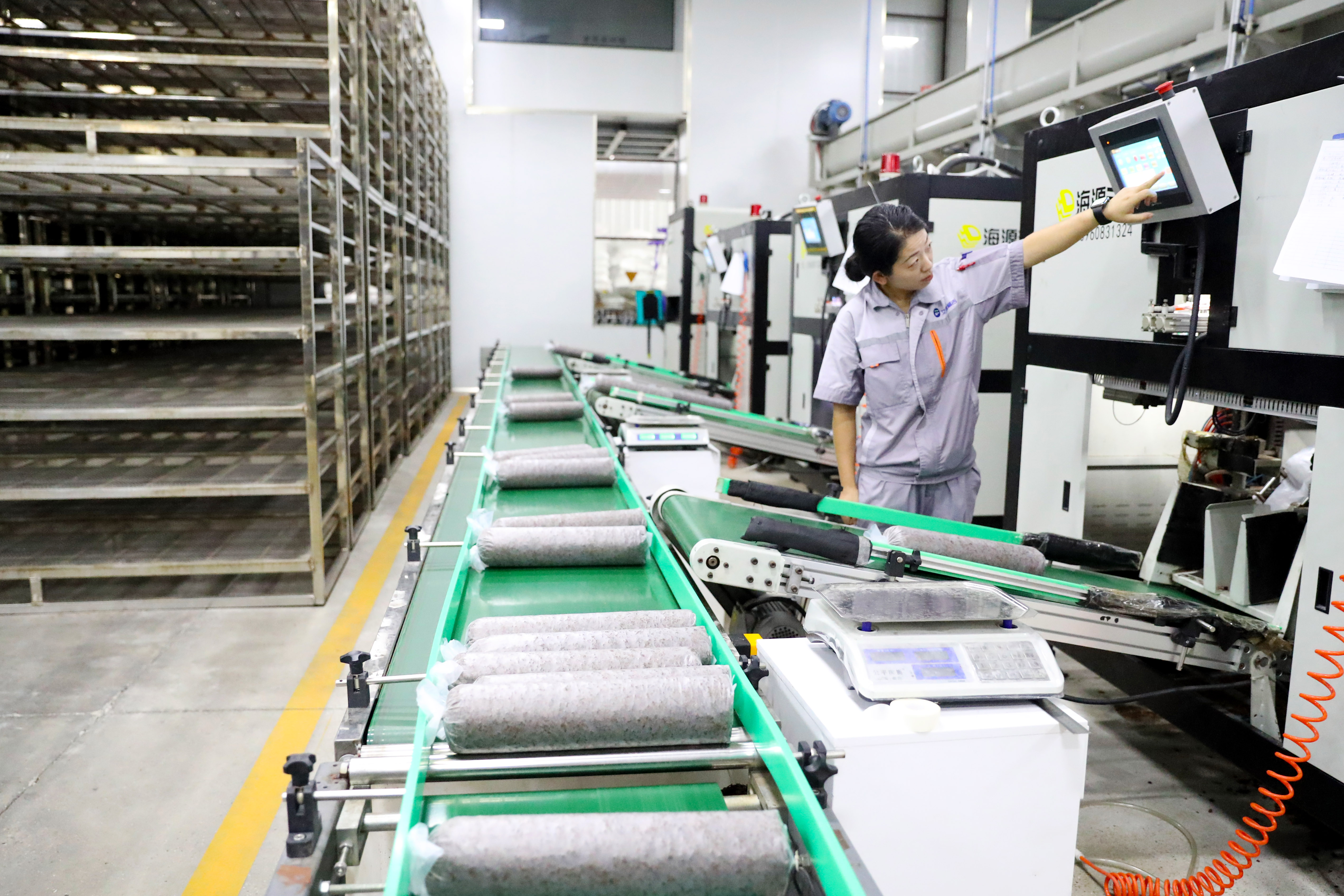 8月13日,在青岛莱西市一家菌菇培育加工企业的菌棒生产线上,工作人员在对设备的参数进行检查。张进刚摄