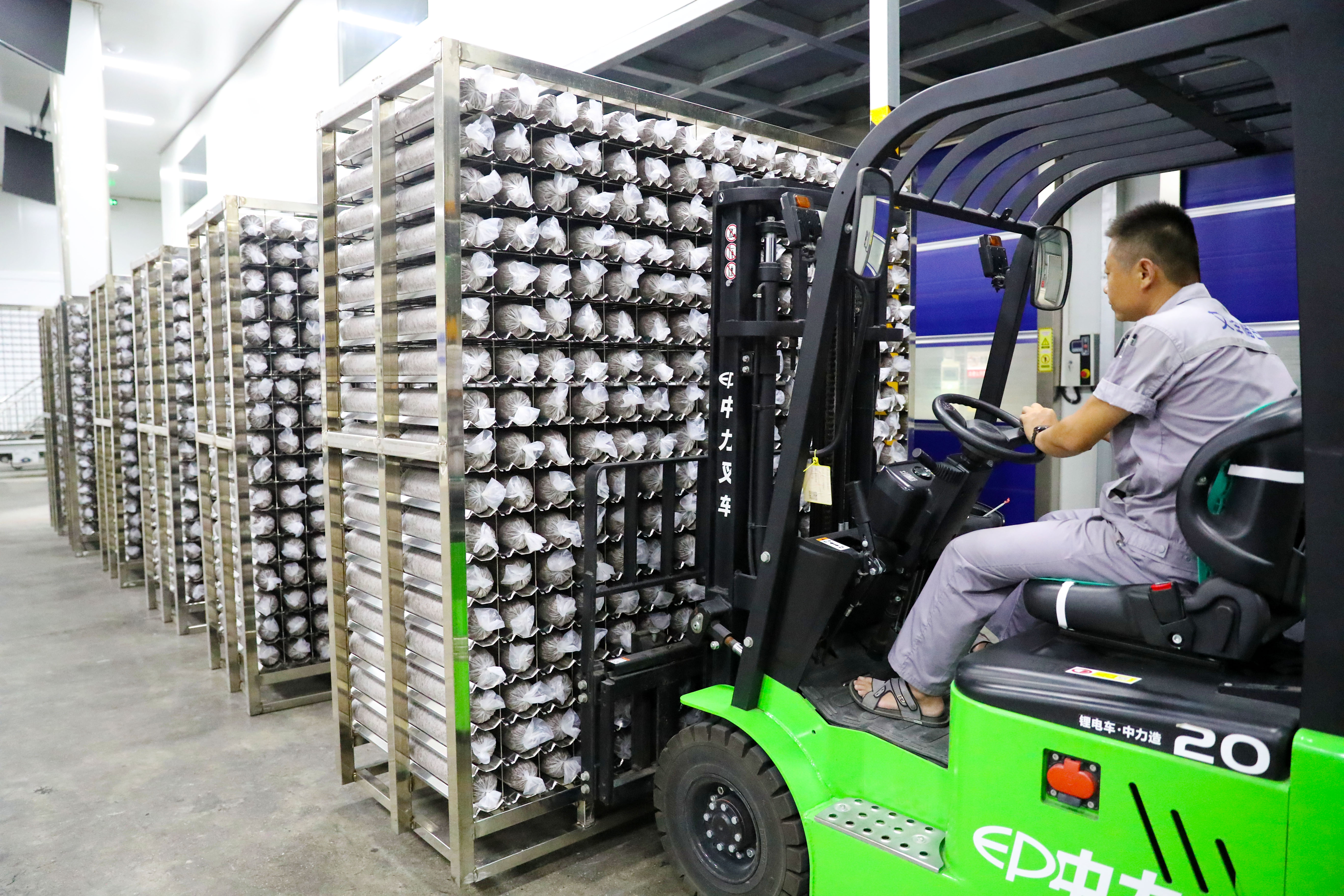 8月13日,青岛莱西市一家菌菇培育加工企业的工作人员在运送刚下线的菌棒。张进刚摄