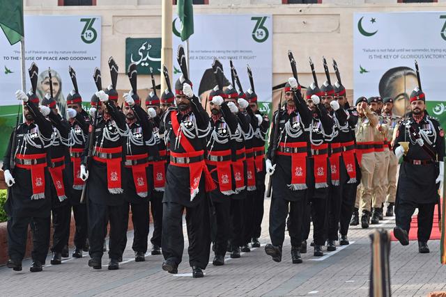 这是8月14日在巴基斯坦拉合尔拍摄的列队参加庆祝独立日活动的巴基斯坦军人。新华社/法新