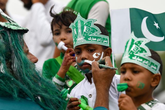 8月14日,在巴基斯坦卡拉奇,一名男子正在小男孩的脸上画上庆祝独立日的图案。新华社/法新