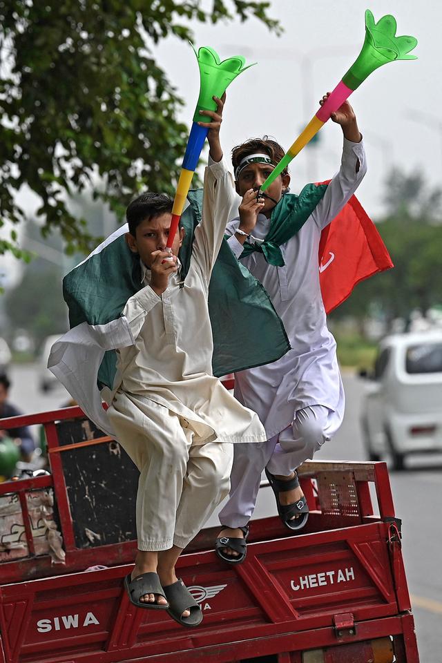 8月14日,在巴基斯坦伊斯兰堡,两名男孩吹着喇叭庆祝独立日。新华社/法新
