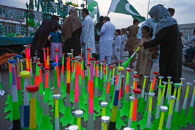 8月14日,在巴基斯坦白沙瓦,一个小女孩购买喇叭庆祝独立日。新华社/法新