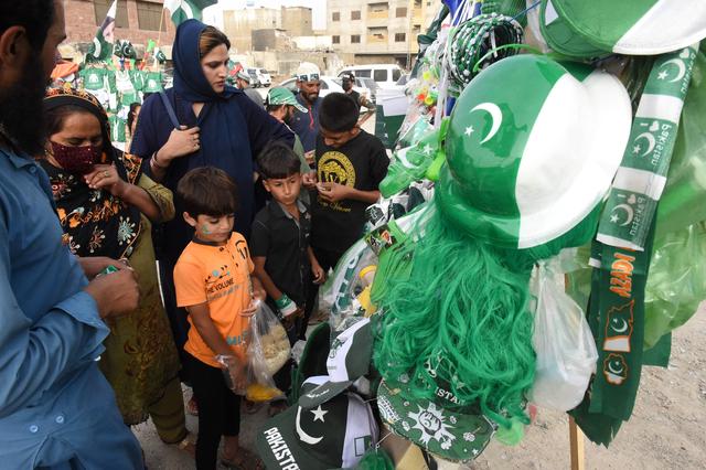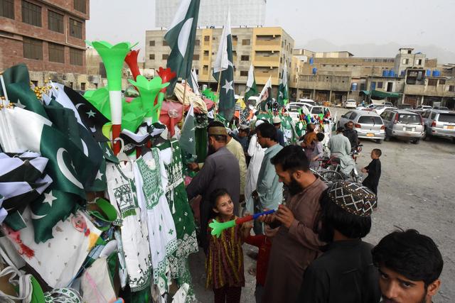 8月13日,在巴基斯坦奎达,人们在市场上购买独立日庆祝用品。新华社/法新