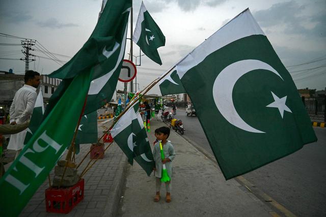 8月13日,在巴基斯坦白沙瓦,小贩在街边出售巴基斯坦国旗。新华社/法新