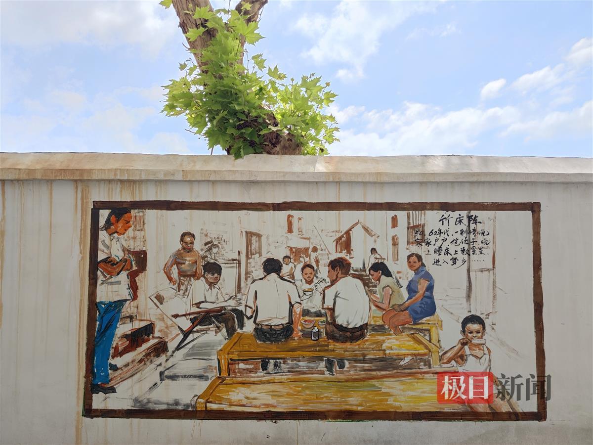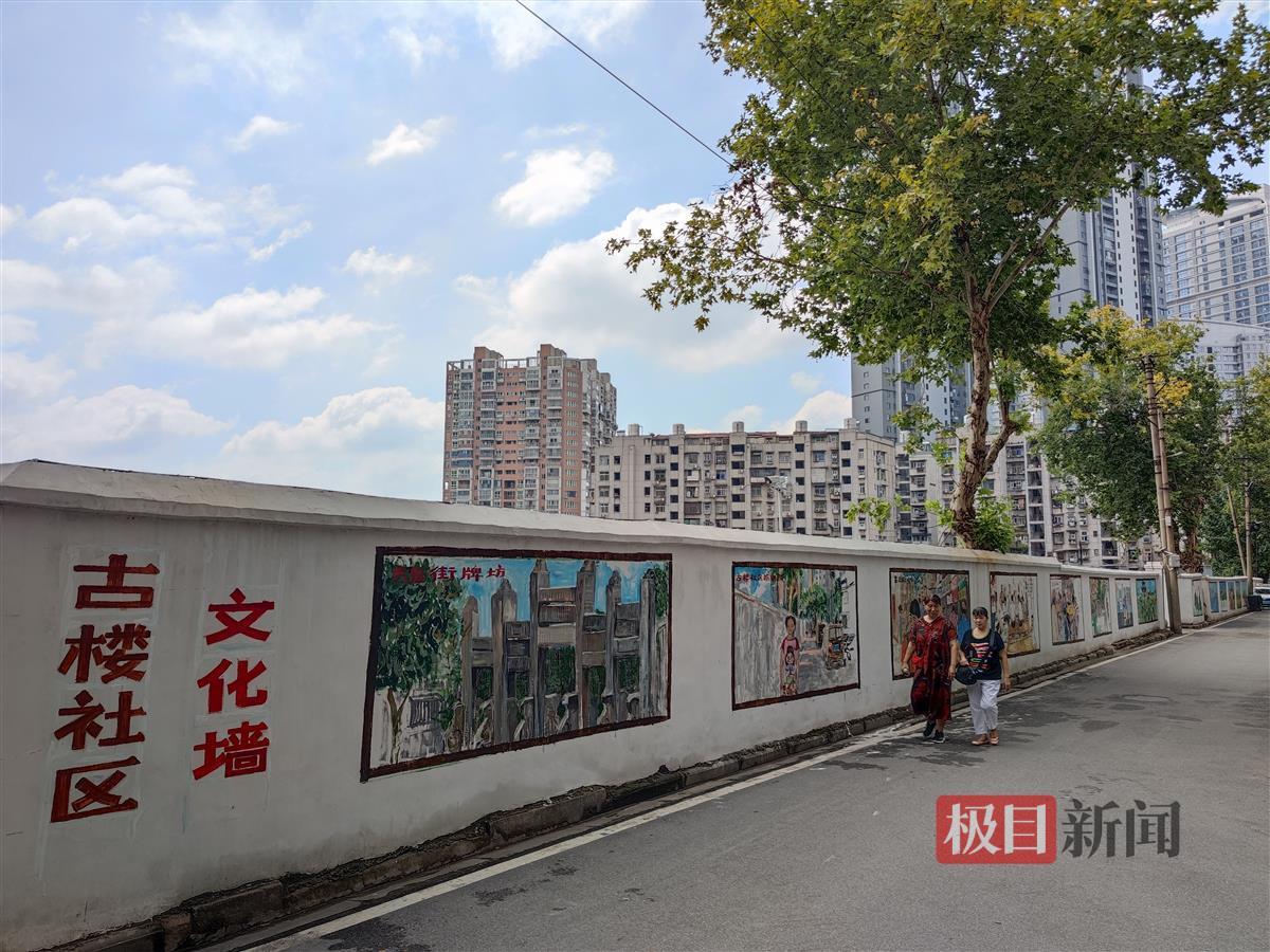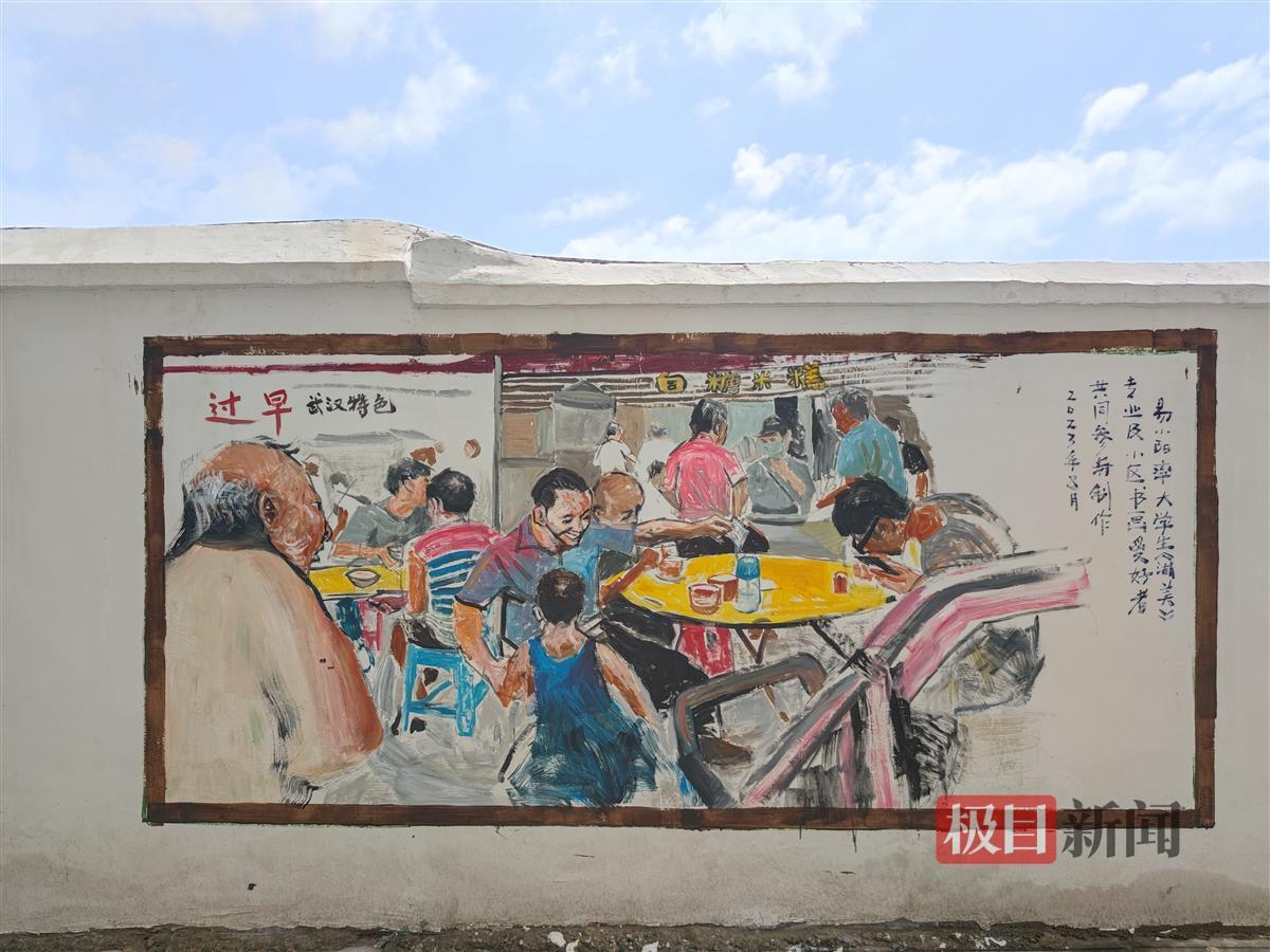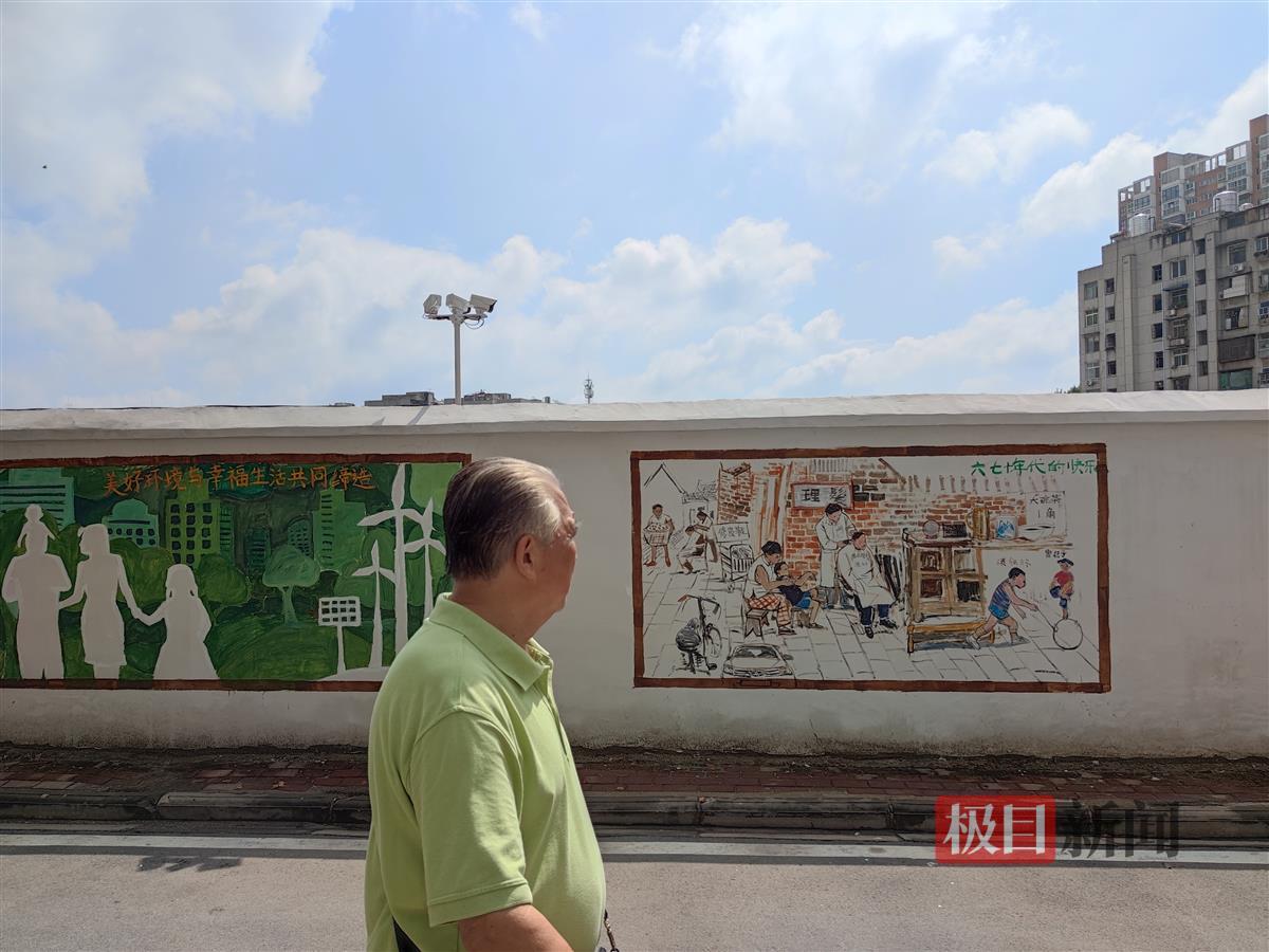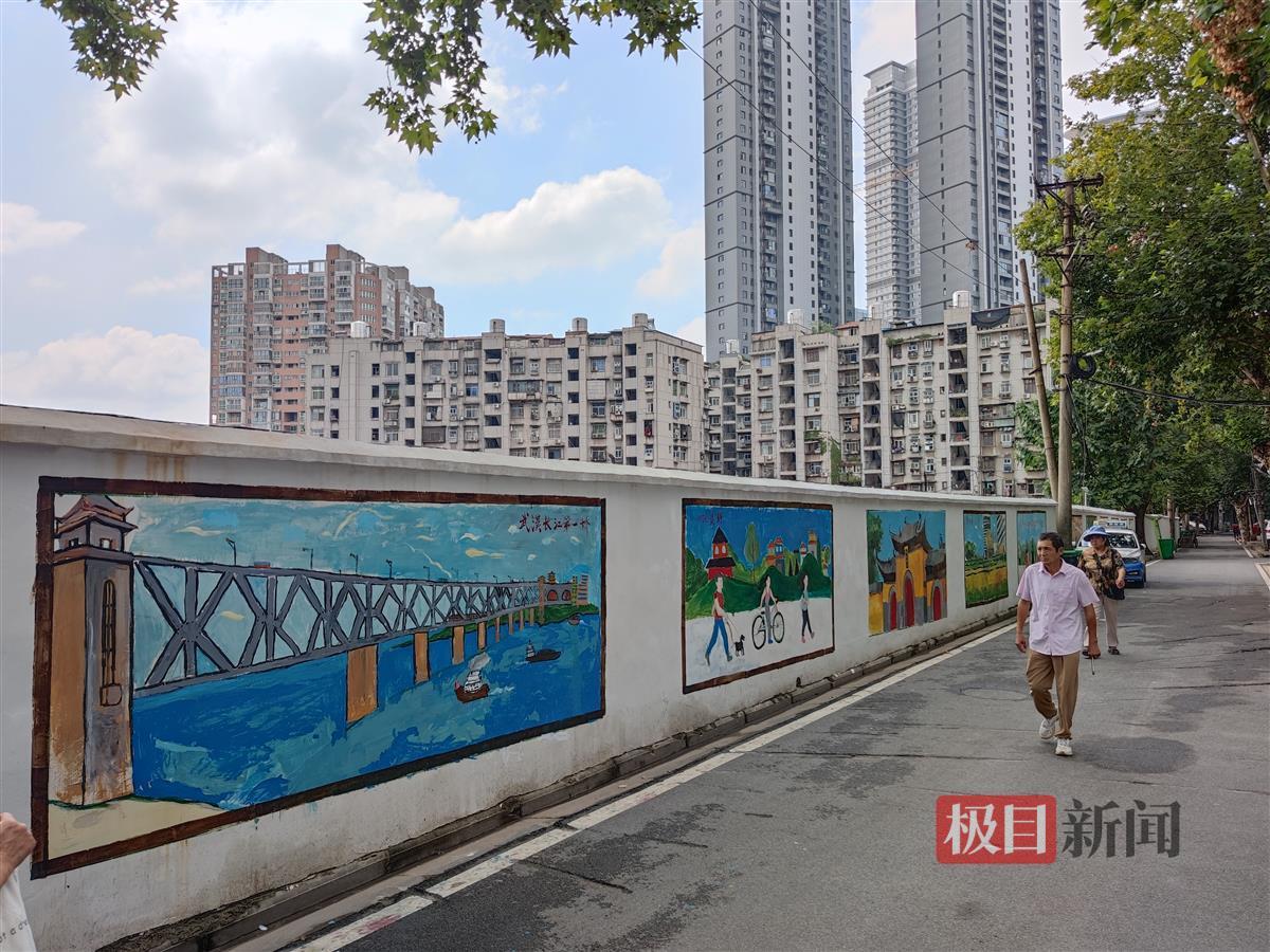 8月22日,汉阳区建桥街道古楼社区,20幅墙绘作品登上社区围墙。充满烟火气息的墙绘作品,如过早、竹床阵等,让200米长的围墙焕然一新,吸引了众多居民驻足观赏。