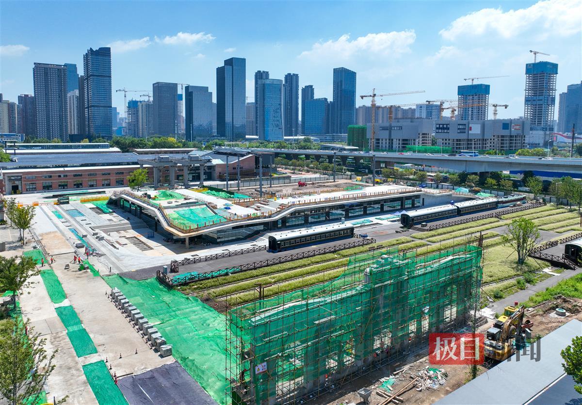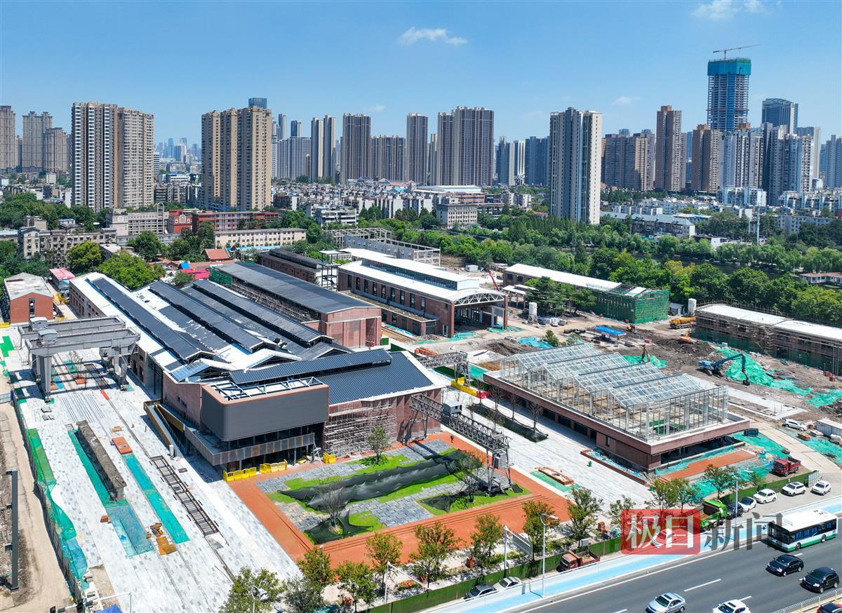 8月23日,俯瞰位于武汉长江二桥武昌桥头的四美塘铁路遗址文化公园。临江大道入口处的复原版老火车站立面景墙正在进行外立面施工,上游型蒸汽机车牵引的绿皮车厢已被改造成怀旧风格的火车餐厅。由铁轨、枕石、信号灯、火车头等元素构建的特色景观遍布全园。