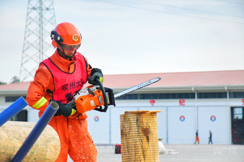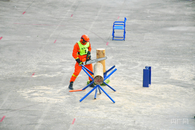 专业技能综合竞技中,一名消防员进行油锯操作(央广网记者龚雯摄)