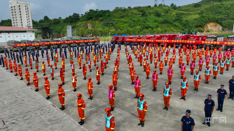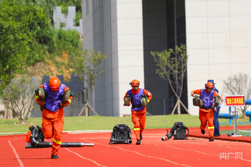 消防员以团队形式分工合作,奔赴团体竞技课目指定区域(央广网记者龚雯摄)