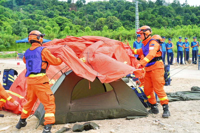 消防员快速架设宿营帐篷(央广网记者龚雯摄)