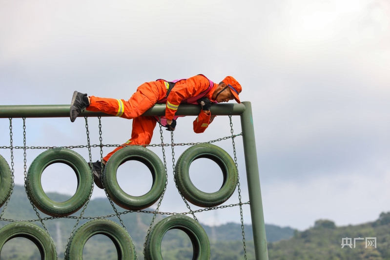 在200米灭火障碍课目中,比武队员翻越障碍物顶端(央广网发李袁辉摄)