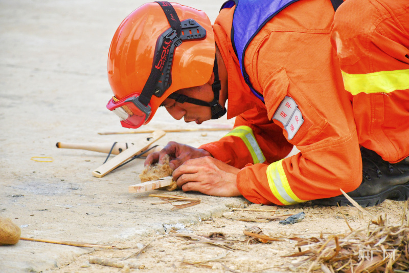 一名消防员细心地进行钻木取火(央广网记者龚雯摄)