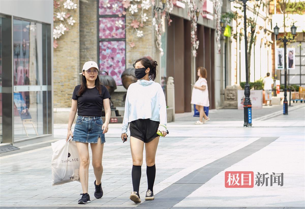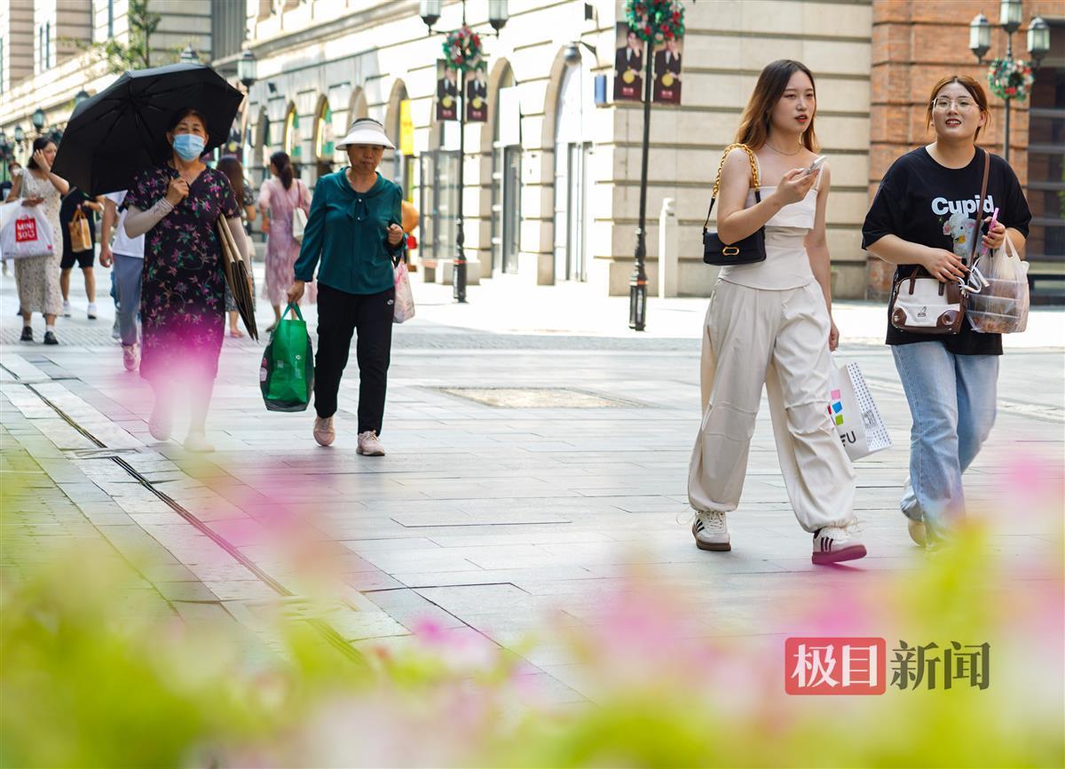 9月9日下午,武汉市武昌区汉街两边的商业楼基本为街面挡住了阳光,但人们行走在街上,感觉气温还是有点高。当日,武汉最高气温为36℃,但户外人体体感温度会高达38℃,三镇再现高温。