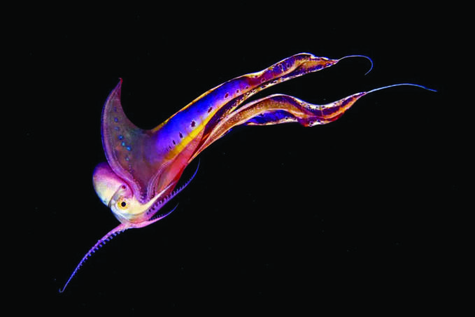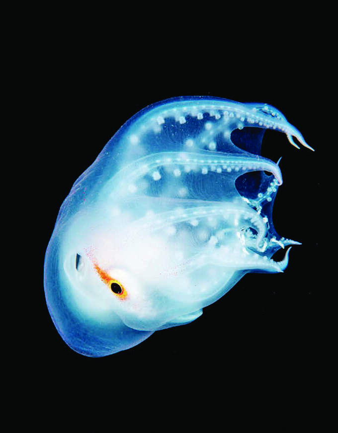 在拍摄过程中,张帆有着许多难忘的经历。2023年2月,张帆前往阿尼洛海域,为了寻找特殊物种。特殊的一天很快就来临了,他记录下了当时的情景:在取景器里,我第一次看到了活生生的七腕章鱼(异夫蛸)。这是一只较大的未成年个体,体长在20厘米左右,这种远洋深海章鱼所生活的海域最深可达8000米以上,成年后体长可达20多米。在这样的深度尝试拍摄需要格外慎重,这基本上已经逼近了我最近尝试进行拍摄的最大深度,因此当它游向更深处时,我有些犹豫,停留在36米深度,目送它走远。结果它往下游了几米之后停了下来,我重新开始缓慢靠近它。只见它突然间将触手打开,绽放成一朵花的形状!我曾很多次在纪录片中看到深海章鱼摆出类似的姿势,但是从未想过能够在自己的取景器里看到这样的景象。心跳越来越快,我的双手在颤抖,激动地连拍了许多张照片。