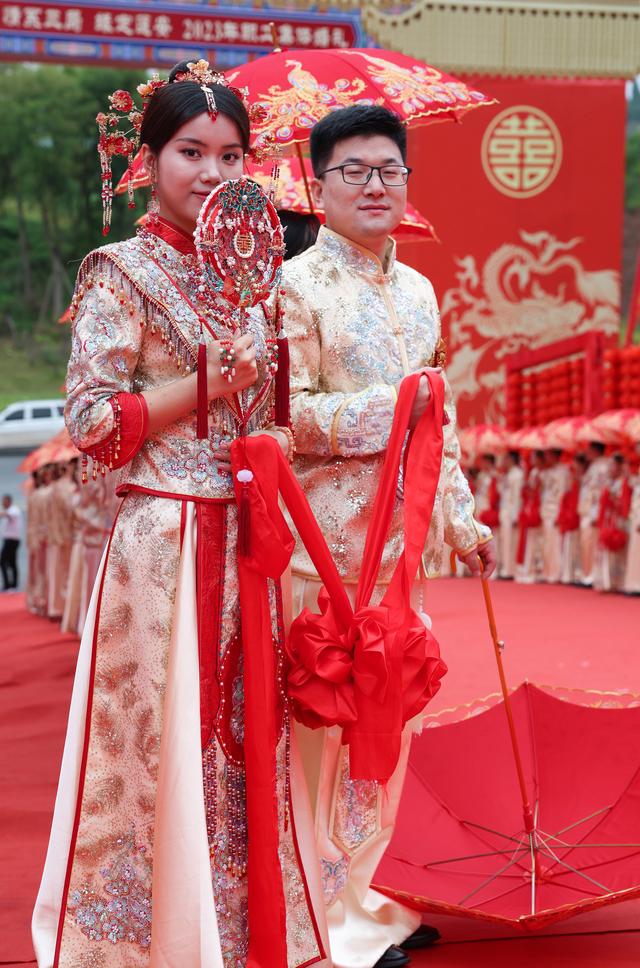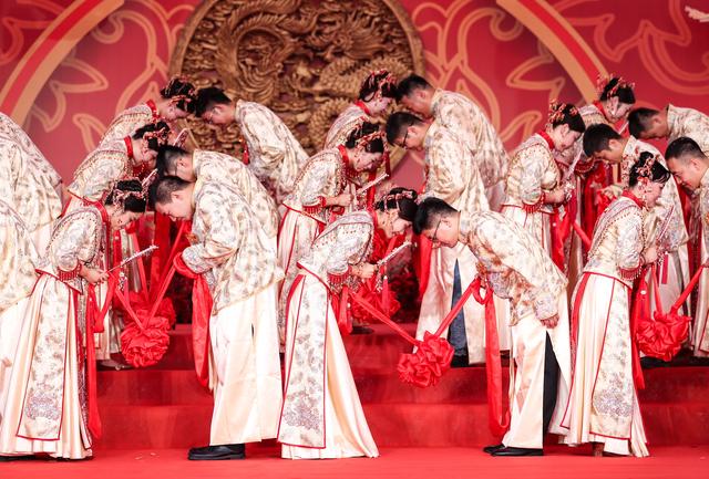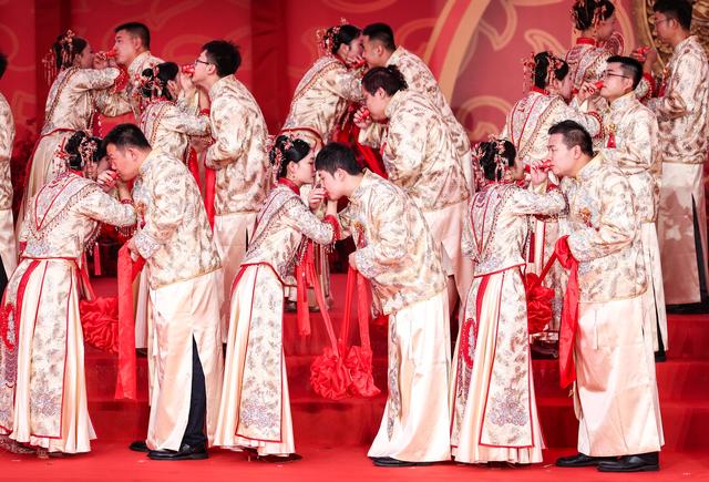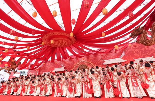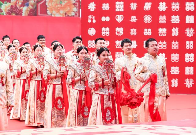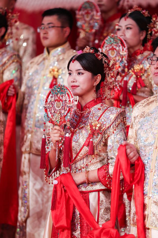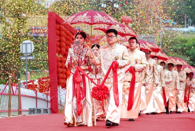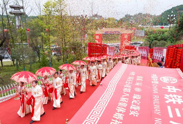 当日,在成达万(成都经达州至万州)高速铁路四川省蓬安县燕山寨隧道口的施工工地,来自中铁三局五公司各建设工地的38对新人,身着中国传统婚礼服饰参加集体婚礼。