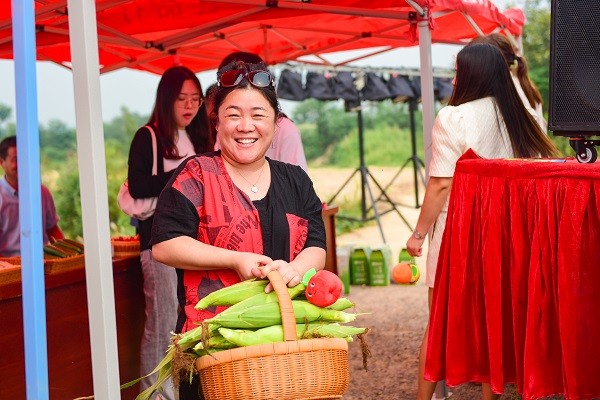 9月1日上午,洛阳老城区洛浦街道井沟社区举办第一届鲜食玉米采摘节,井沟村民李大姐手提刚从地里摘下的玉米喜笑颜开。(洛阳市文明办供图)