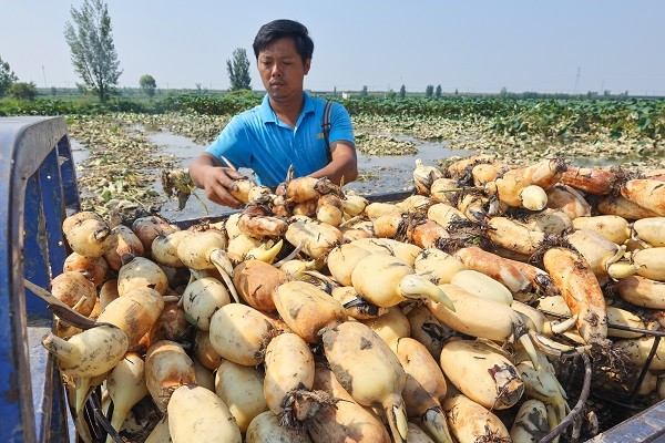 挖藕、冲洗、分装、运输,藕农们分工明确。8月31日,开封市顺河回族区土柏岗街道盘石村千亩荷田里的早熟莲藕进入了采收期,藕农们在荷田里采挖成熟的莲藕,装车外运,一派繁忙景象。