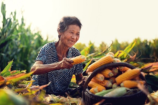 9月7日,洛阳新安县铁门镇刘杨村一位老太太处理着刚丰收的玉米,难掩喜悦之情。(新安县文明办供图)