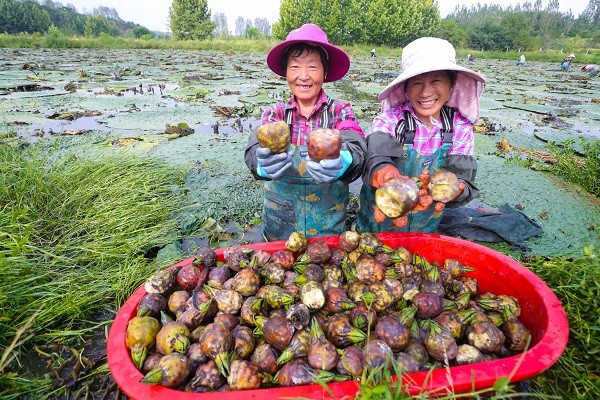 8月24日,信阳市光山县司马光小镇升辉合作社农民正在水中采摘菱角。“像我们这些年纪大的,不便外出务工,现在家门口采摘菱角,每天挣100多元,心里很满足。”50多岁的采菱工宋阿姨提起在家门口就业的感受,笑呵呵地说。光山县是国家重点生态功能区,水资源总量8.6亿立方米,境内湖塘堰坝星罗棋布。近年来,该县依托优质的水资源条件,大力发展水产养殖,菱角、芡实、莲藕等水生植物种植,带动群众增收致富。槐店乡按照“党支部+合作社+农户”种植经营模式,于2016年引进在外创业成功人士黄镜升返乡,成立升辉农业合作社,从湖北省洪湖引进了优良菱角品种,利用水塘、洼地扩大菱角种植面积,大力发展富民产业、观光旅游业,带动当地80余名村民就近务工,人均年增收2000余元。