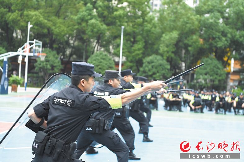 特警队员左手持盾牌、右手持警棍,动作娴熟有力,一招一式气势尽显。9月20日,长沙市公安局特巡警支队举行2023年度警棍盾牌术会操,16支参赛队伍操练警棍盾牌术,提高实战格斗技能,锤炼血性胆气。