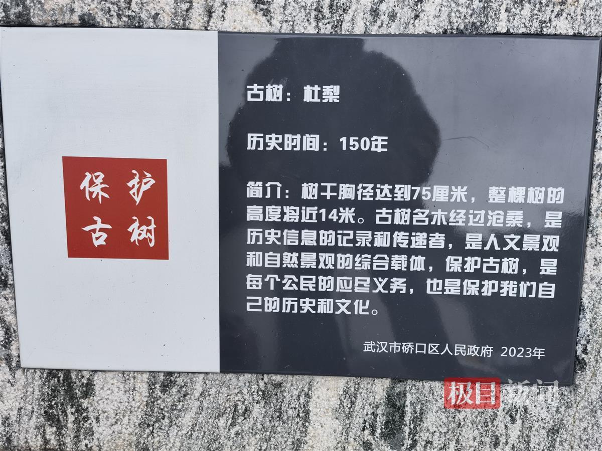 这位市民向硚口区园林局反映后,经园林部门和武汉市园林科研院到现场科学测定:该树是一棵约有150年的古树。这是武汉市中心城区唯一的杜梨古树。