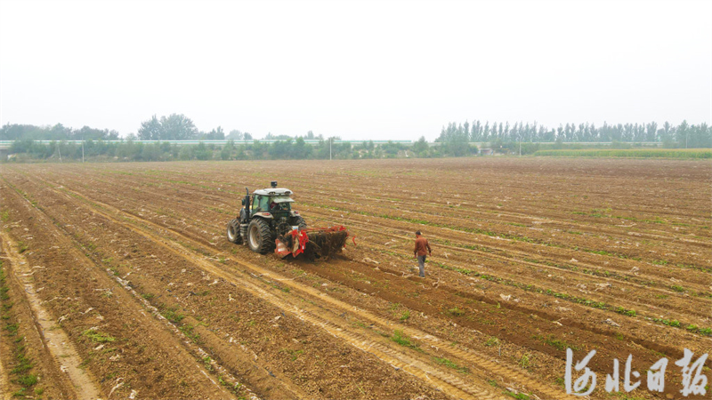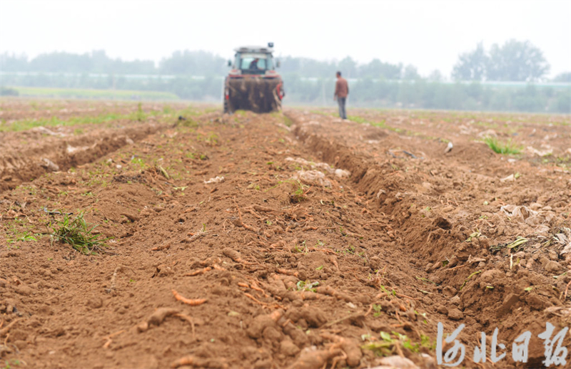 9月26日,在南宫市崔家屯村中药材种植基地,农民驾驶机械采挖地黄。