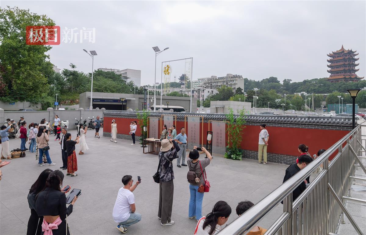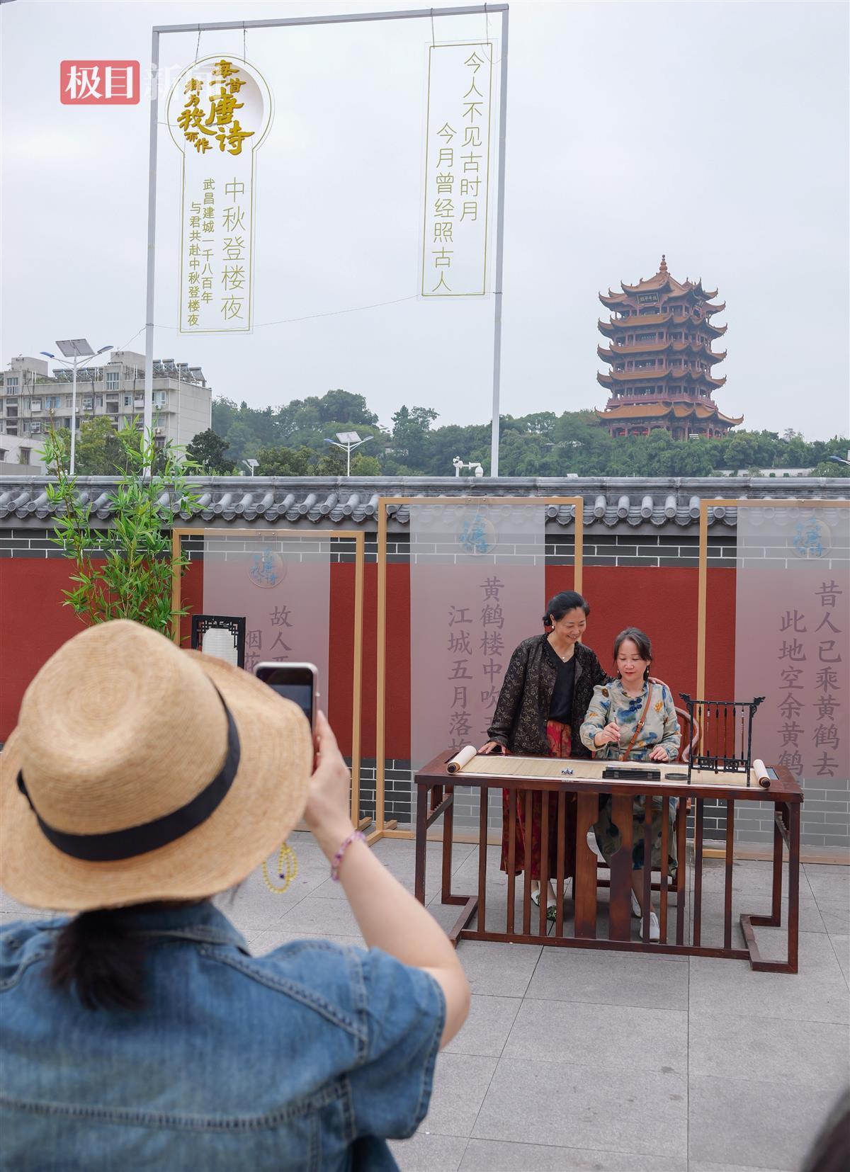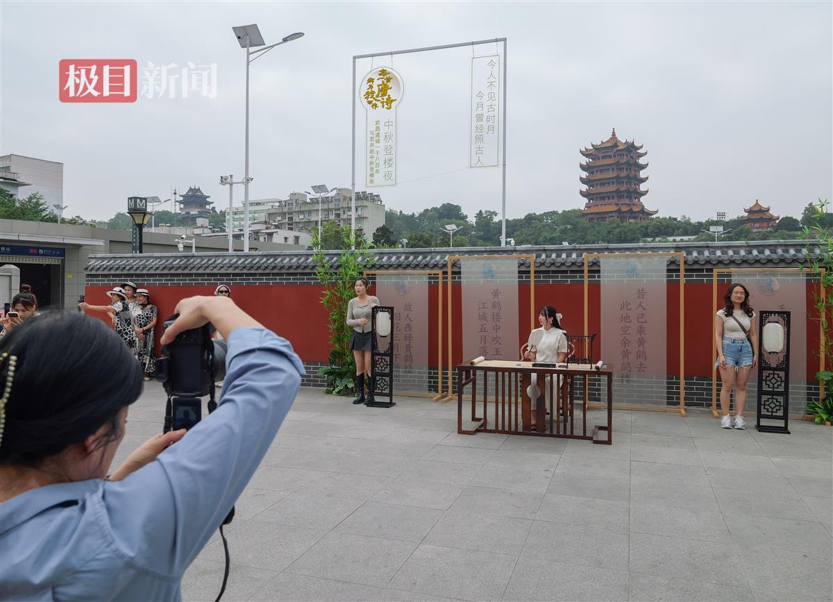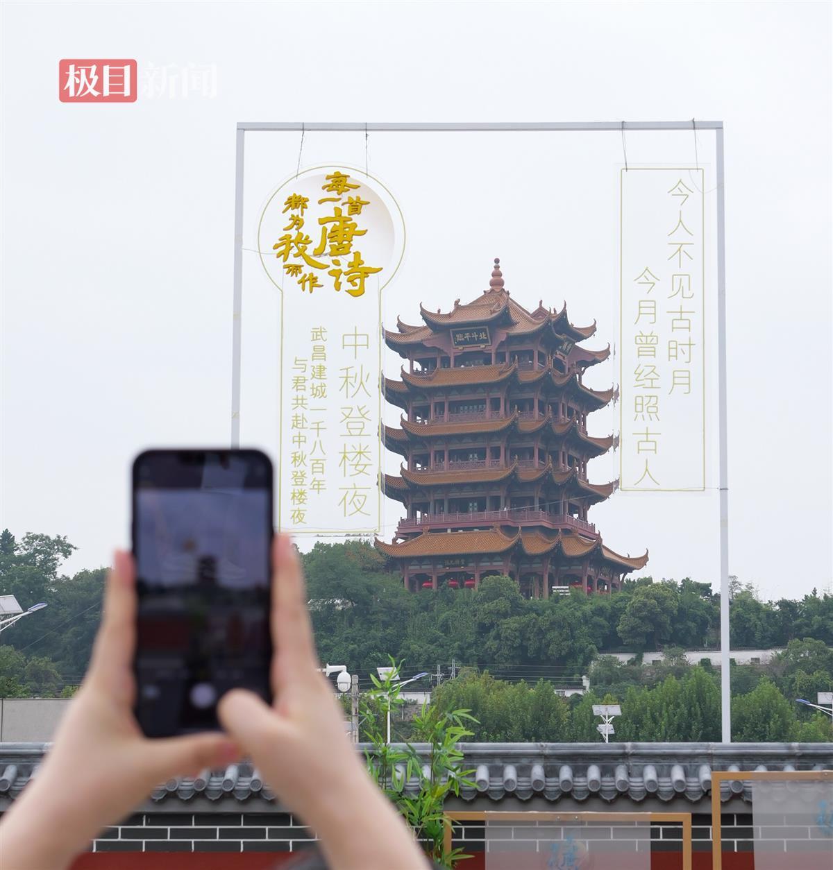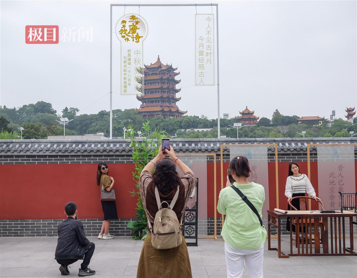 和黄鹤楼相关的唐诗被制作成复古屏风,红墙下还增设书法案台和笔墨纸砚供游客打卡炫照,中秋国庆氛围感拉满。