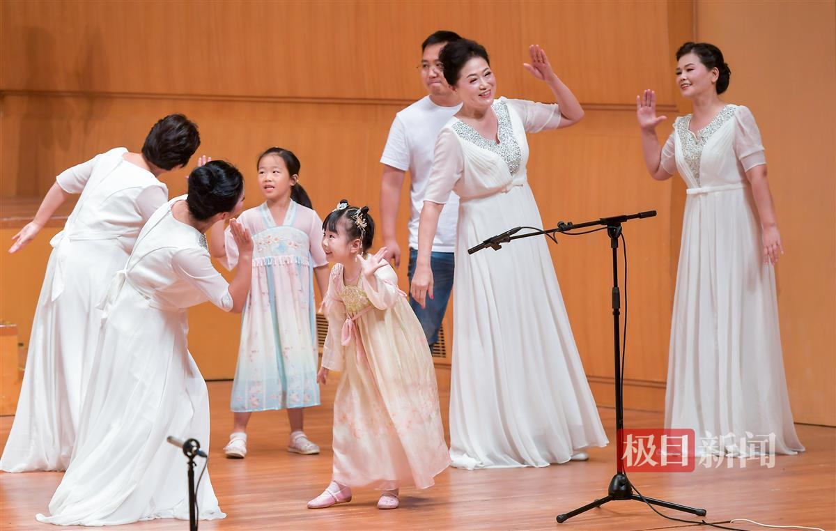音乐会接近尾声,到“我们一起来唱孩子们的歌”环节时,部分团员的儿女和孙子孙女等亲属一起上台互动,大家一起手拉手唱起《你笑起来真好看》《大王叫我来巡山》等歌曲,将全场气氛推向高潮。