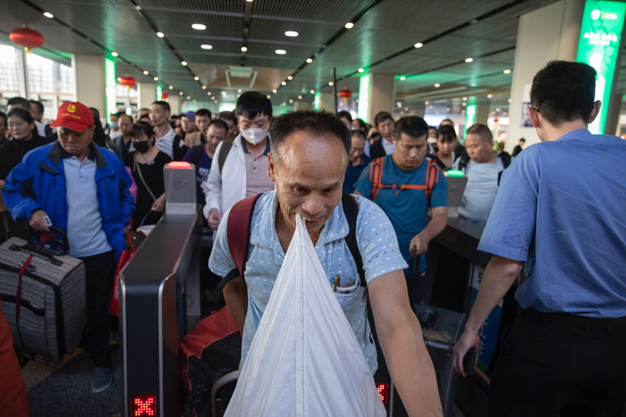 9月28日,北京丰台站,一名旅客正“手口并用”带着物品通过检票口。
