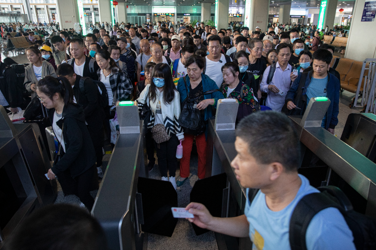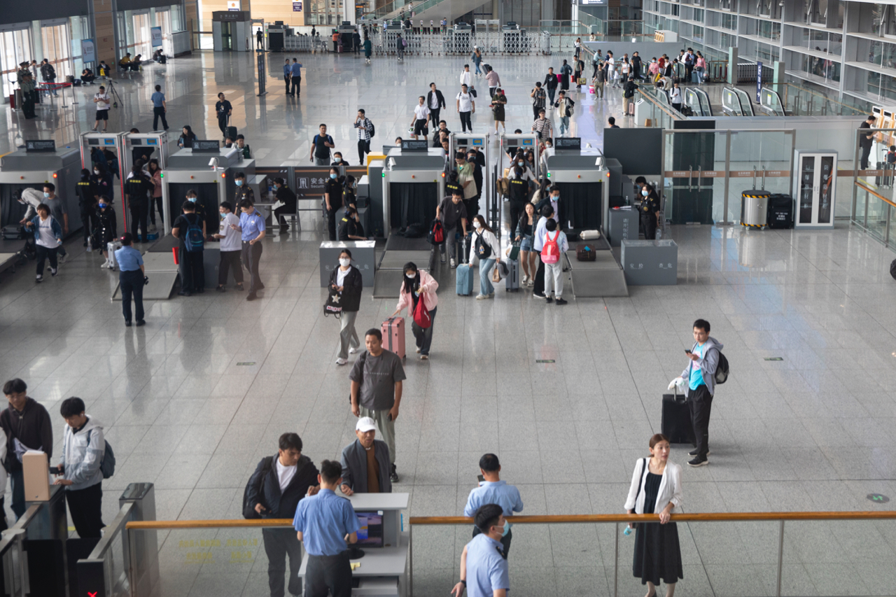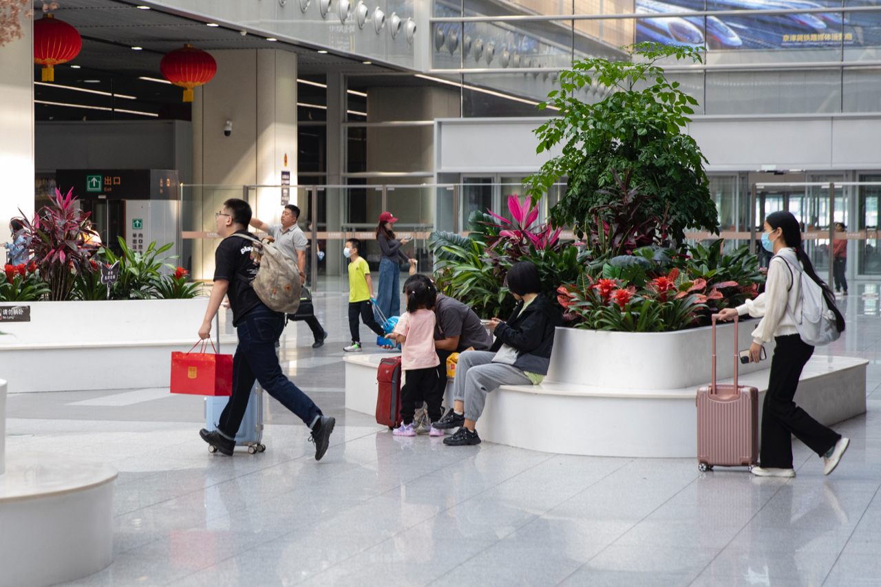 9月28日,北京丰台站,旅客正在工作人员的引导下有序进站。