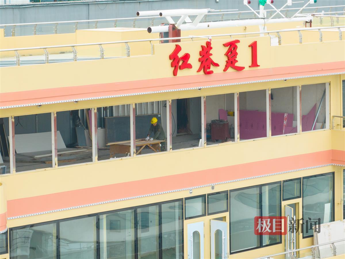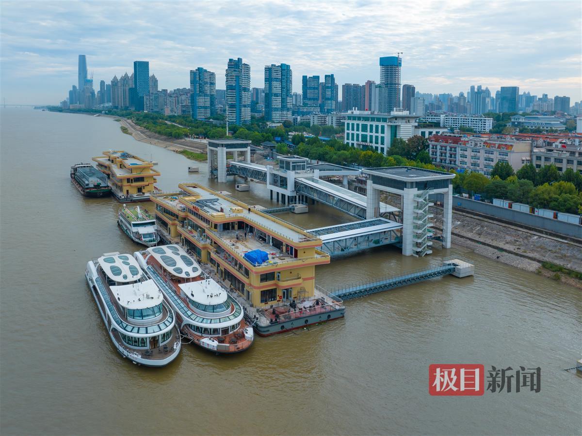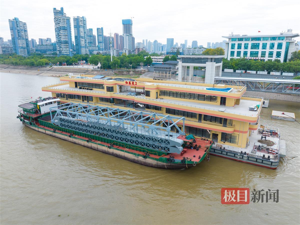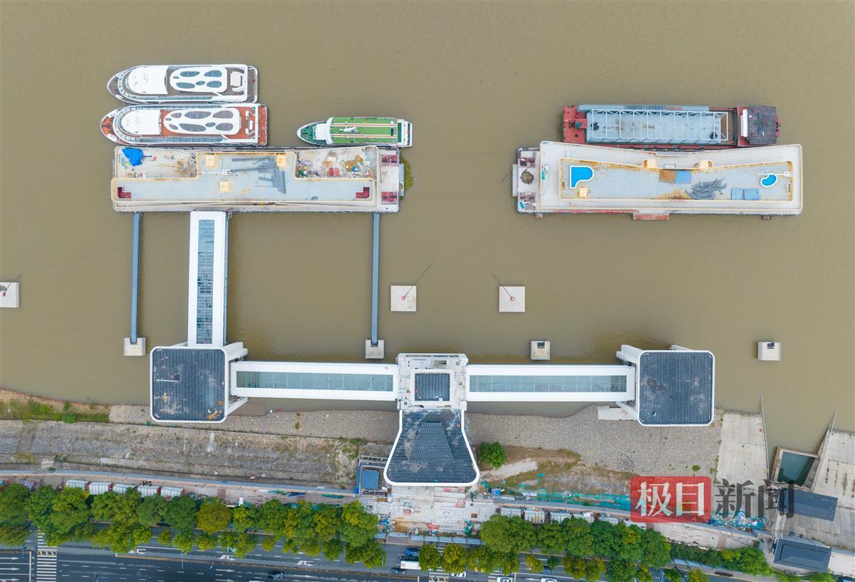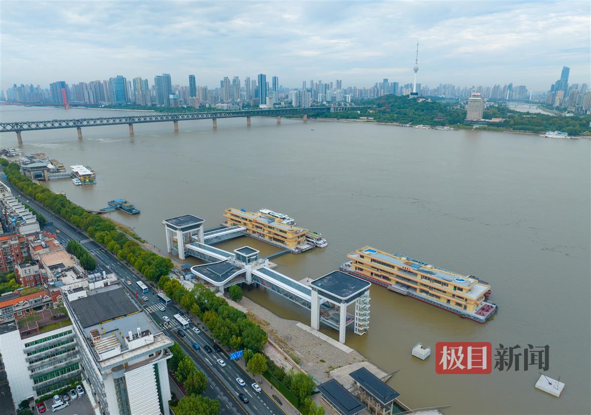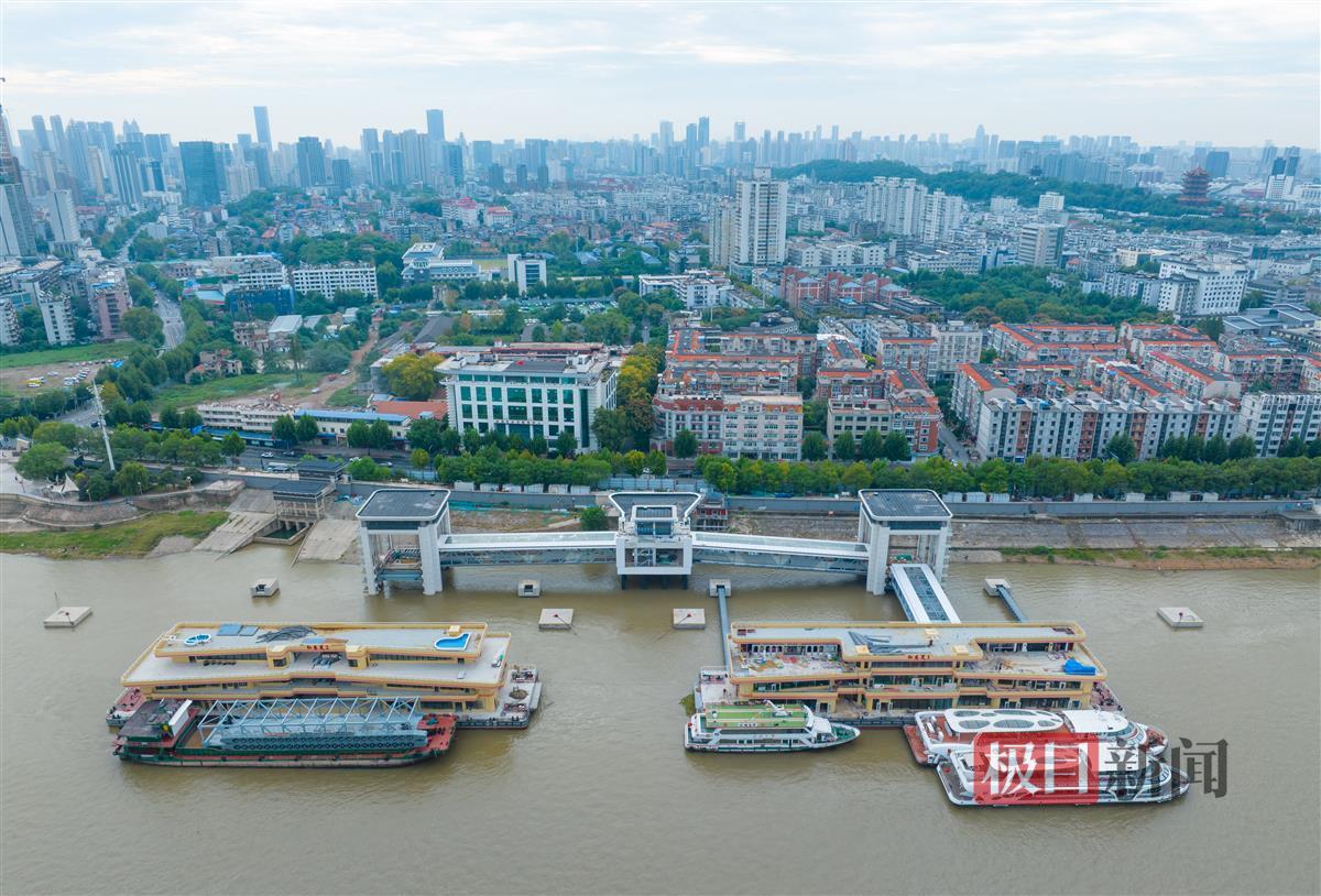 10月9日,俯瞰建设中的武汉港核心区趸船码头改造提升项目(中华路客运码头)。码头主体已基本完工,造型如“大鹏展翅”。名为“红巷趸1”“红巷趸2”的两艘全新趸船正系泊在码头,施工人员正在对趸船内部进行装修。
