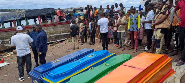 10月16日,在刚果(金)姆班达卡,人们站在沉船事故遇难者的棺材旁。新华社/路透