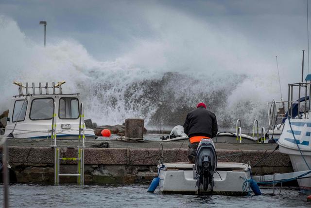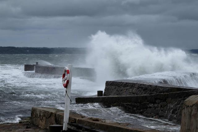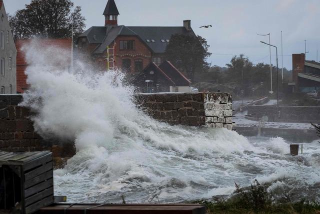 10月20日,在丹麦博恩霍尔姆岛北部阿灵厄港,海浪拍打堤岸。新华社/法新