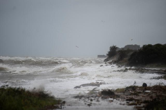 10月20日,在丹麦博恩霍尔姆岛北部,海浪拍打堤岸。新华社/法新