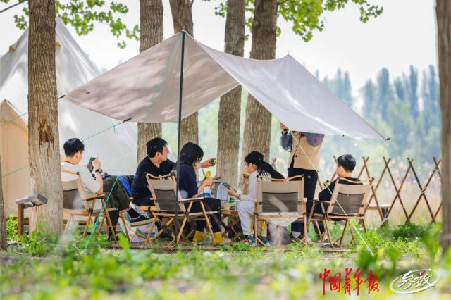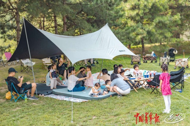 在北京市朝阳公园,张哲沅与很久不见的中学校友露营野餐,他觉得,“露营活动非常具有青春气息”。中青在线记者林天羽/摄