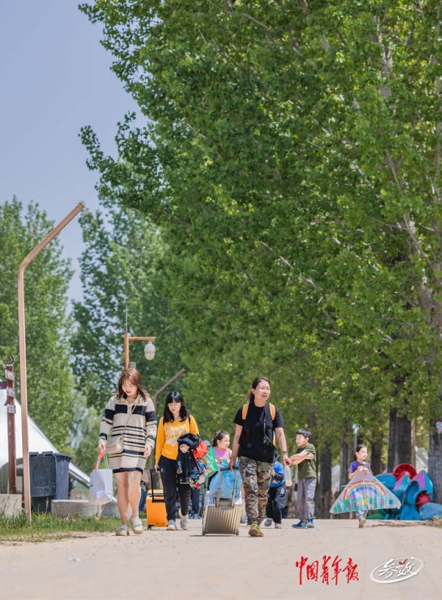 在北京市延庆区世界葡萄博览园,人们正搬运行李,准备前往帐篷营地。中青在线记者林天羽/摄