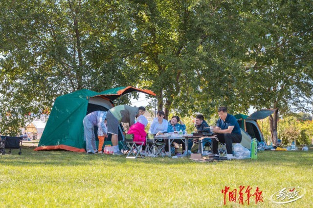 在辽宁省大连市某露营地,人们在帐篷前烤肉、野餐。中青在线记者林天羽/摄