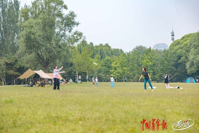 在北京市朝阳公园,人们正在露营帐篷前进行飞盘活动。中青在线记者林天羽/摄
