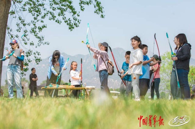 在北京市延庆区世界葡萄博览园内,人们正在体验射箭活动。中青在线记者白杨/摄