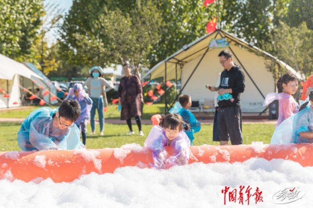 在辽宁省大连市某露营地,小朋友们正在玩耍。中青在线记者林天羽/摄