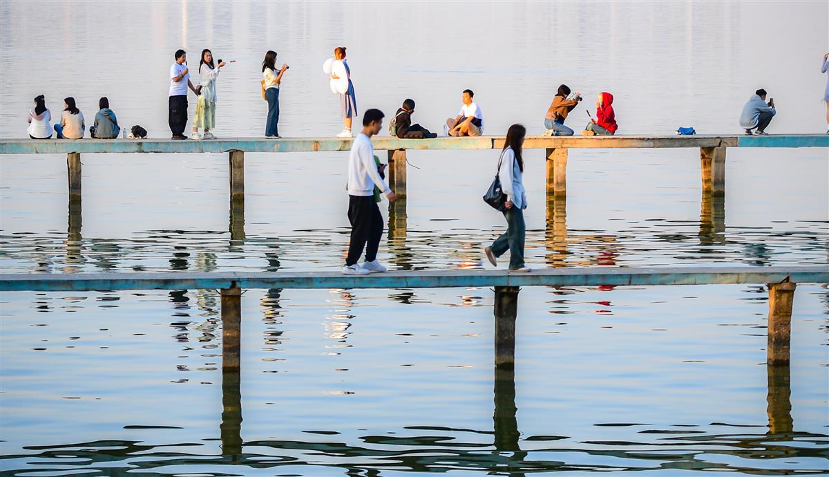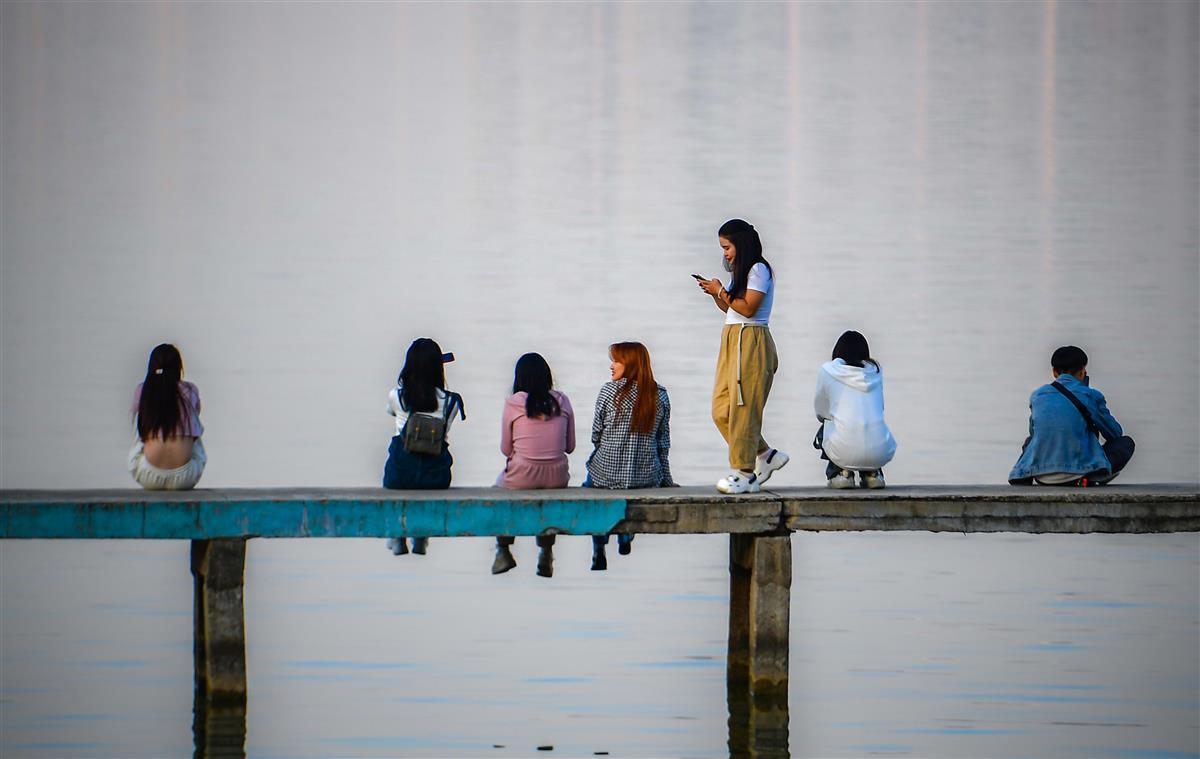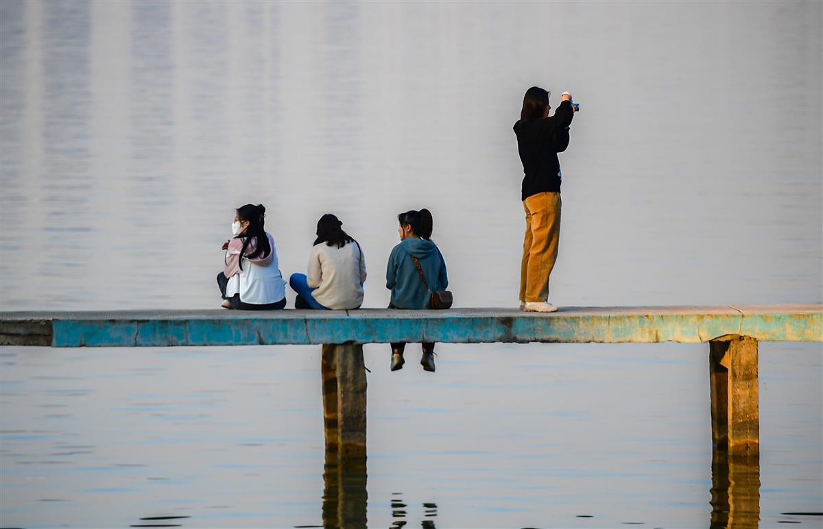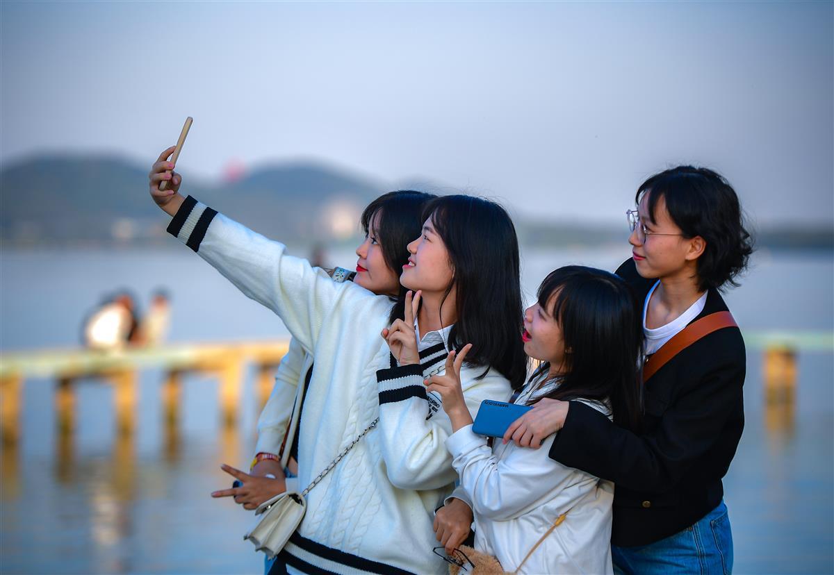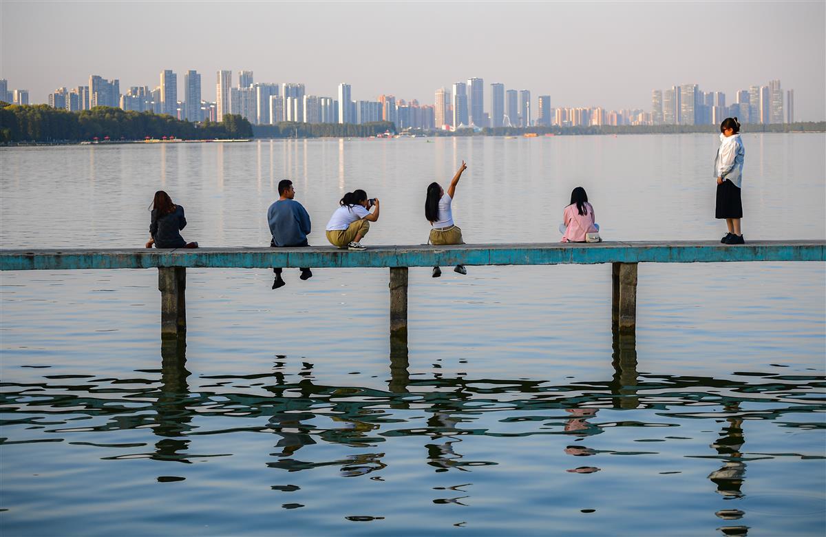 10月23日下午,武大凌波门,湖中纵横交错的栈道上,迎来了一批又一批看风景的游客,他们或坐或站或低声细语,或静静欣赏东湖的美丽景色,或用手中的相机或手机记录这难得的美景。他们也成为了这里的一道独特风景。