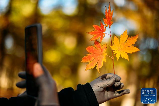 ↑市民在长春市百木园拍摄红叶(10月19日摄)。新华社记者 许畅 摄