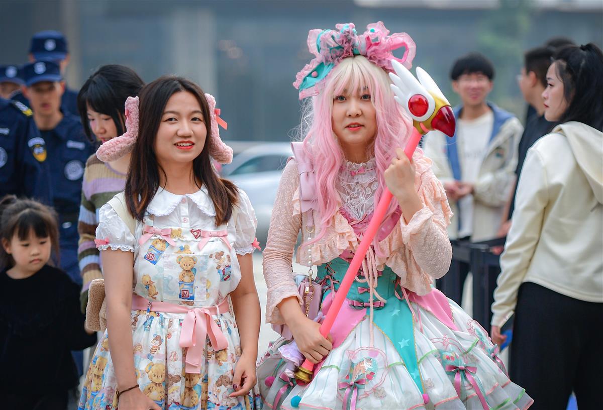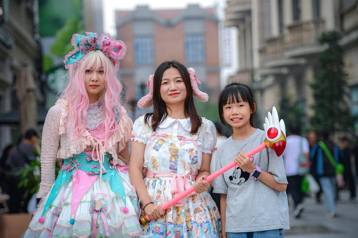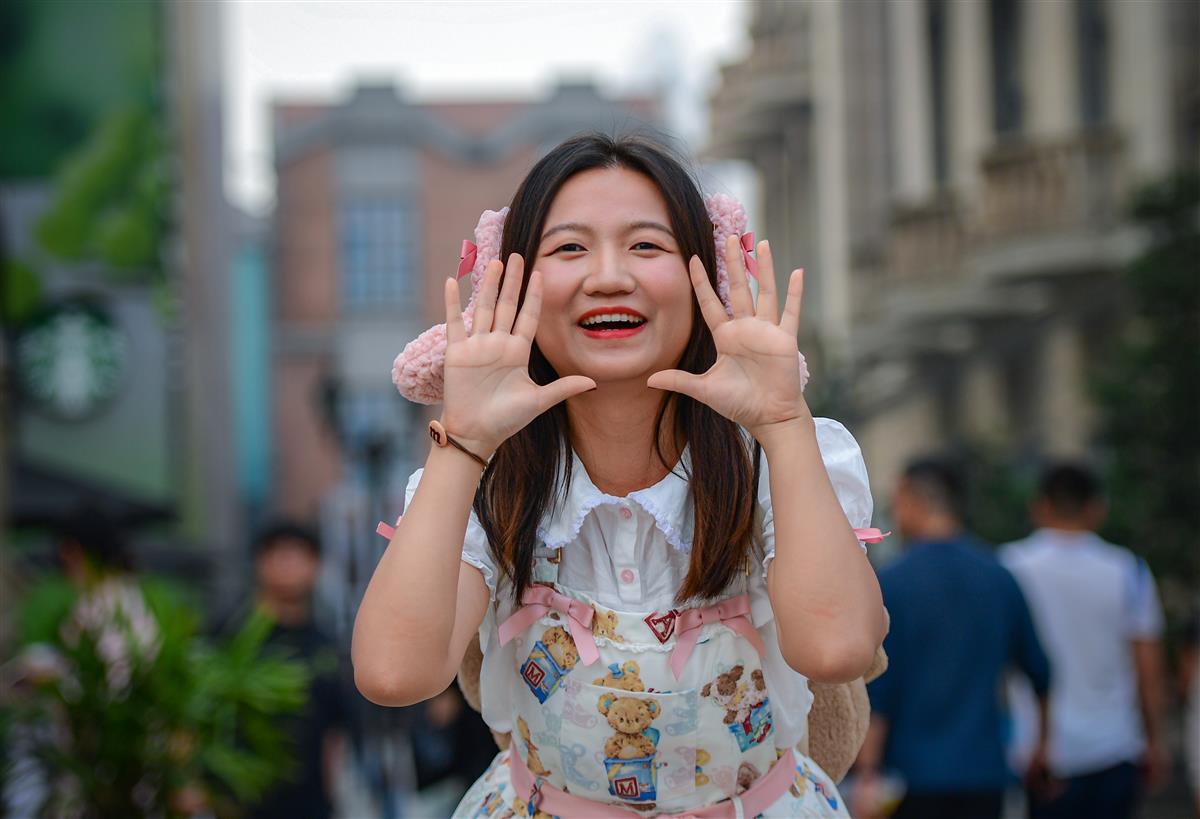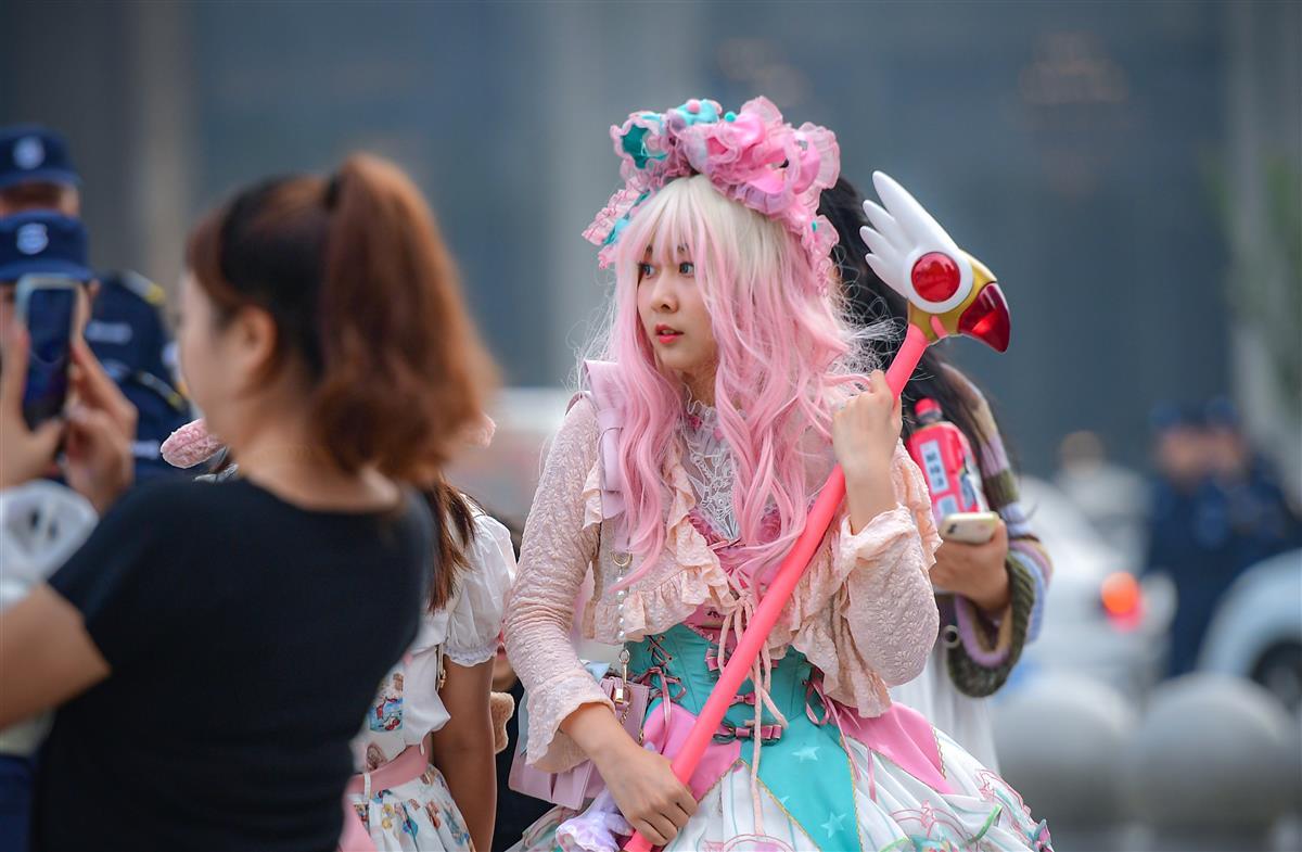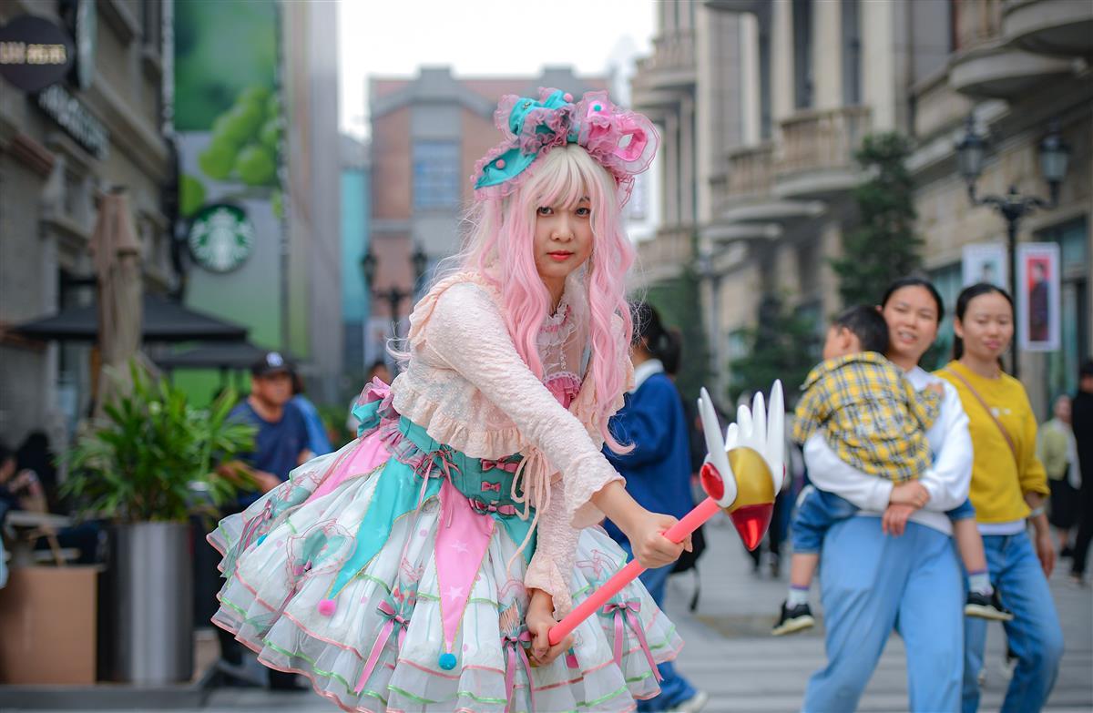 “魔法少女”走在汉街,大家纷纷侧目打量,有小朋友高兴地上前与她合影留念。“魔法少女”也十分热情开朗,她摆出各种姿势,与游客互动,让大家感受到了动漫cosplay的魅力。