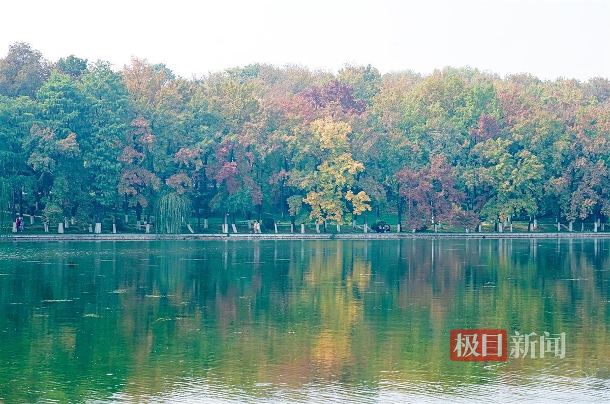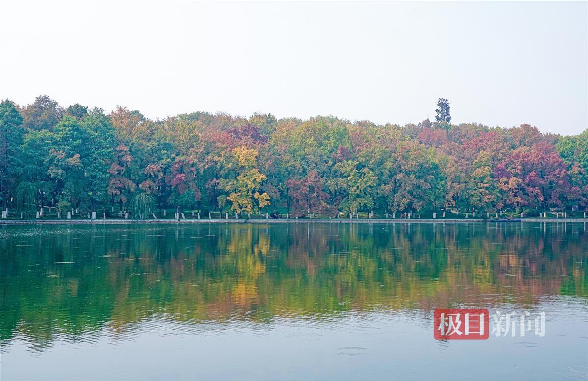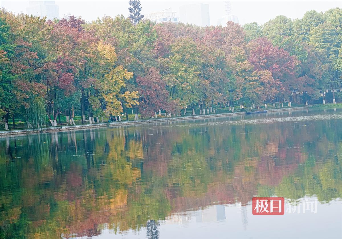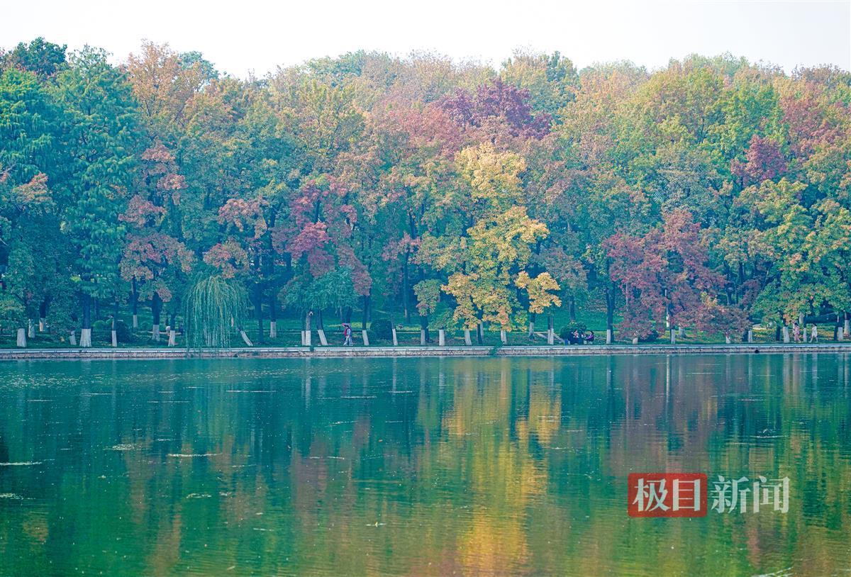 10月30日,在武汉东湖碧潭观鱼景点附近的岸边,枫叶开始变黄、变红。红黄绿的树叶与湖中的倒影,成为秋天东湖的一道美丽风景线。