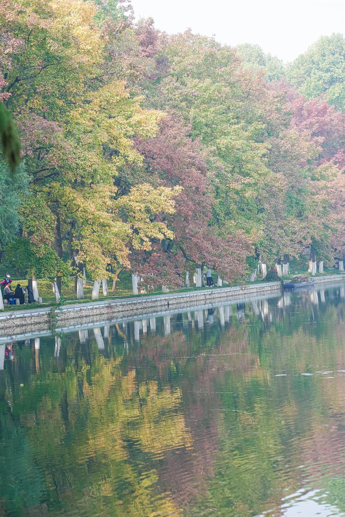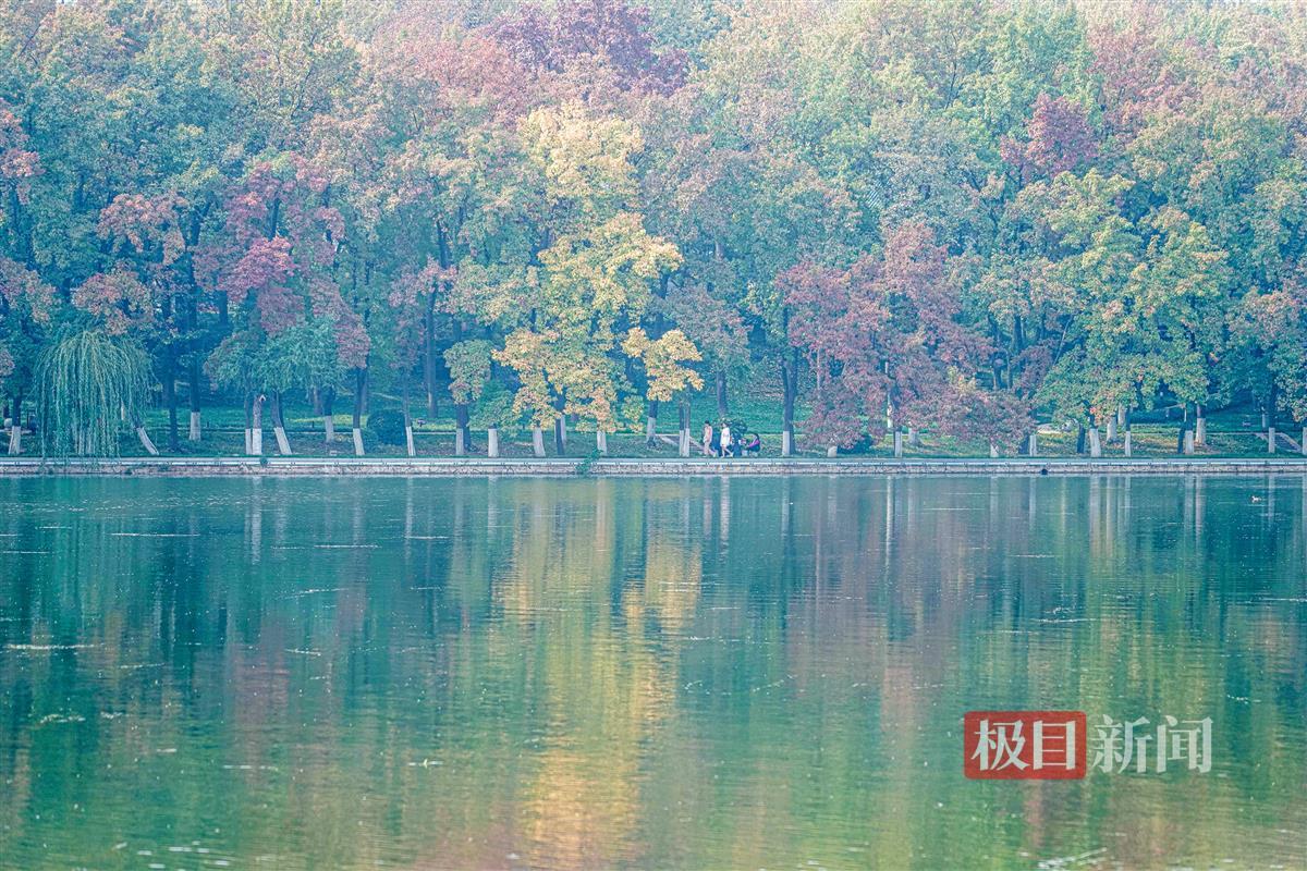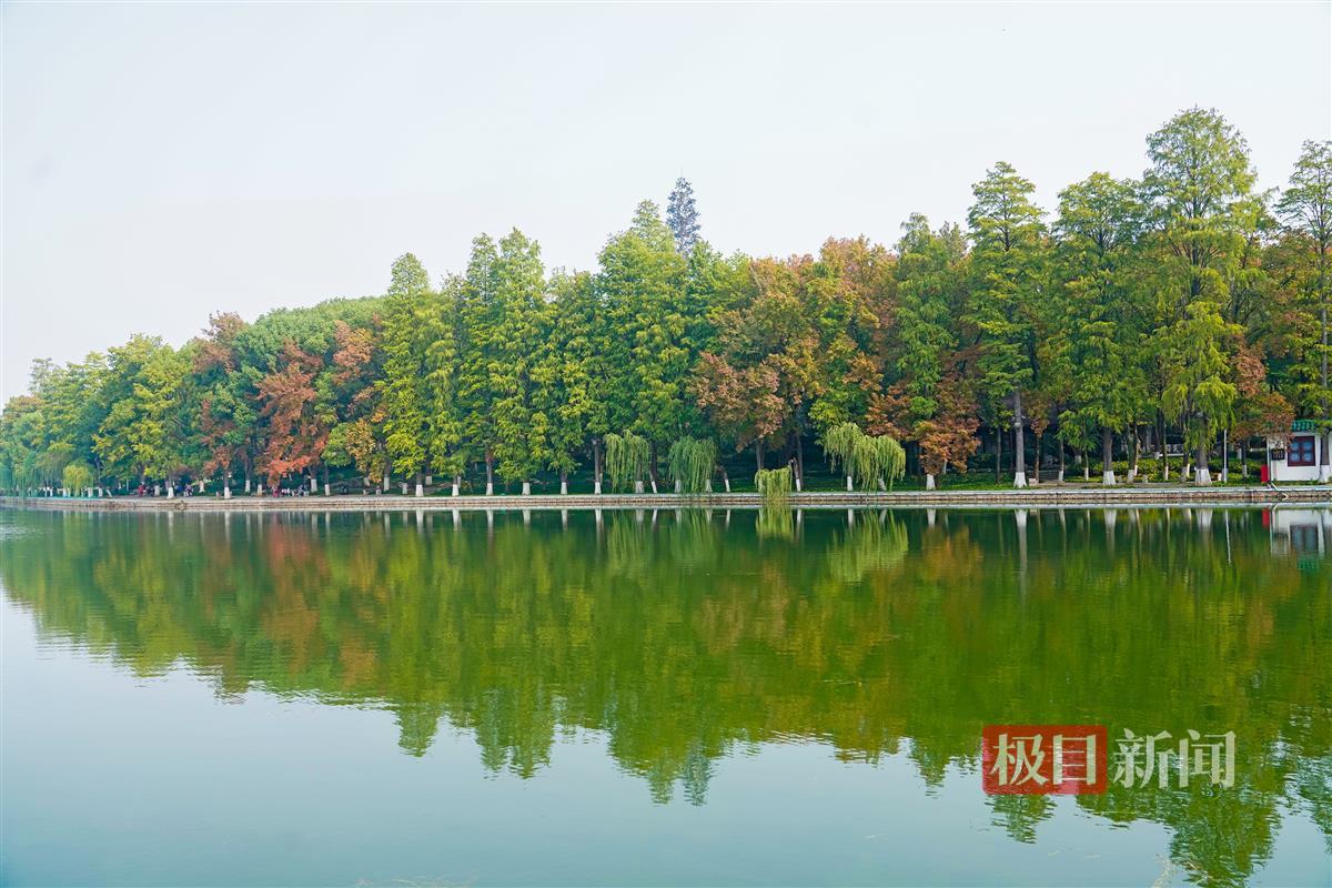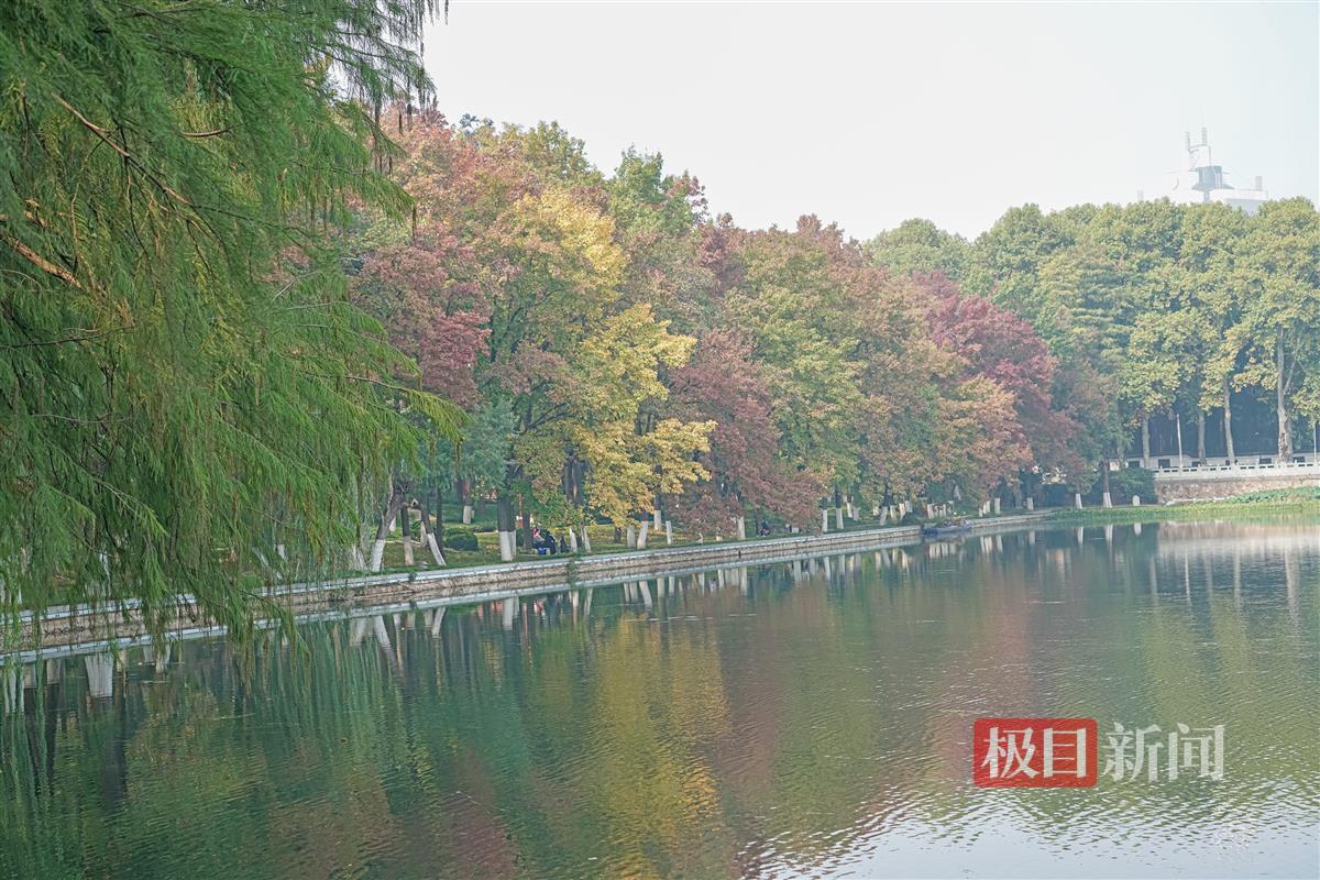 10月30日,在武汉东湖碧潭观鱼景点附近的岸边,枫叶开始变黄、变红。红黄绿的树叶与湖中的倒影,成为秋天东湖的一道美丽风景线。