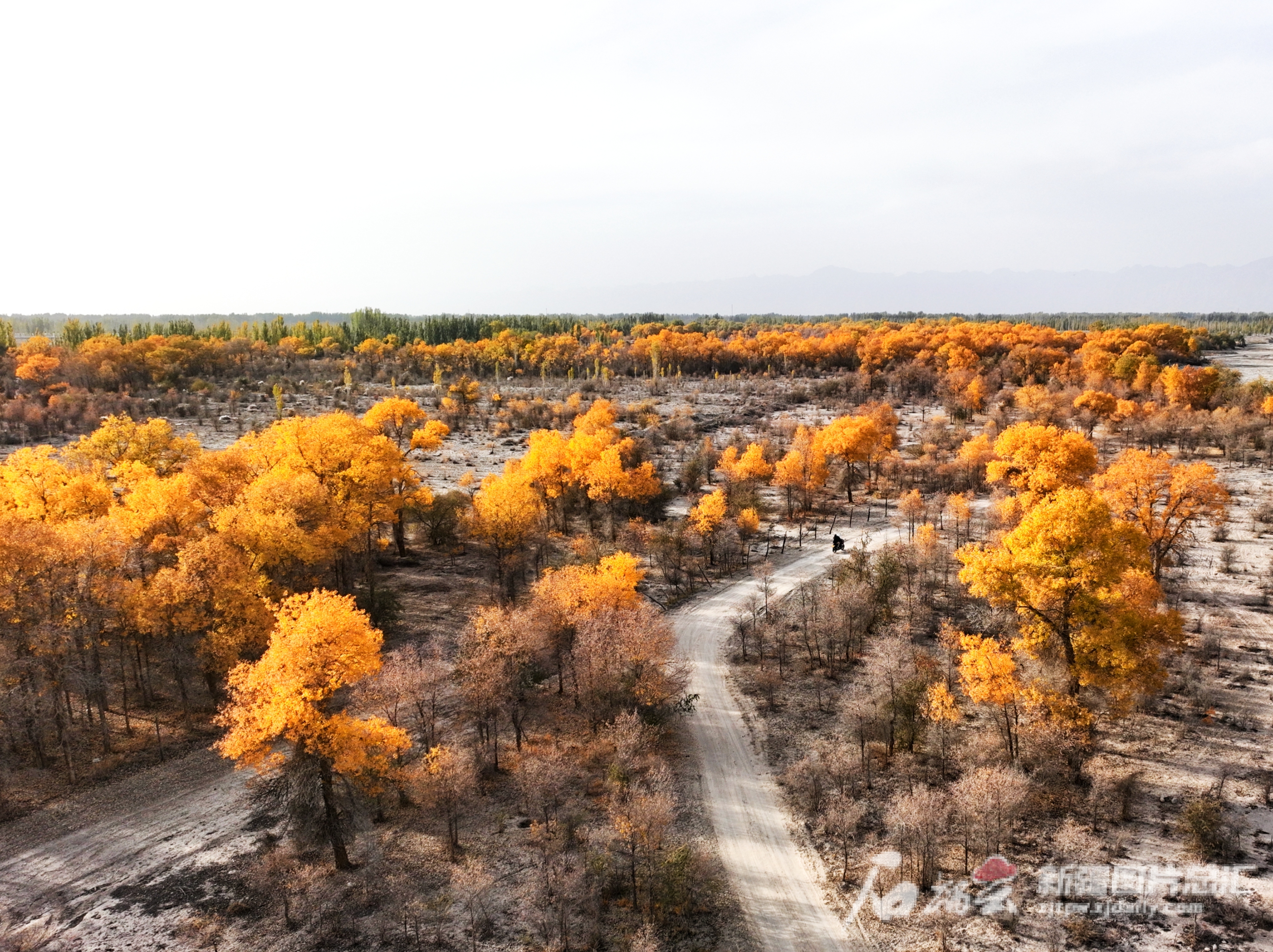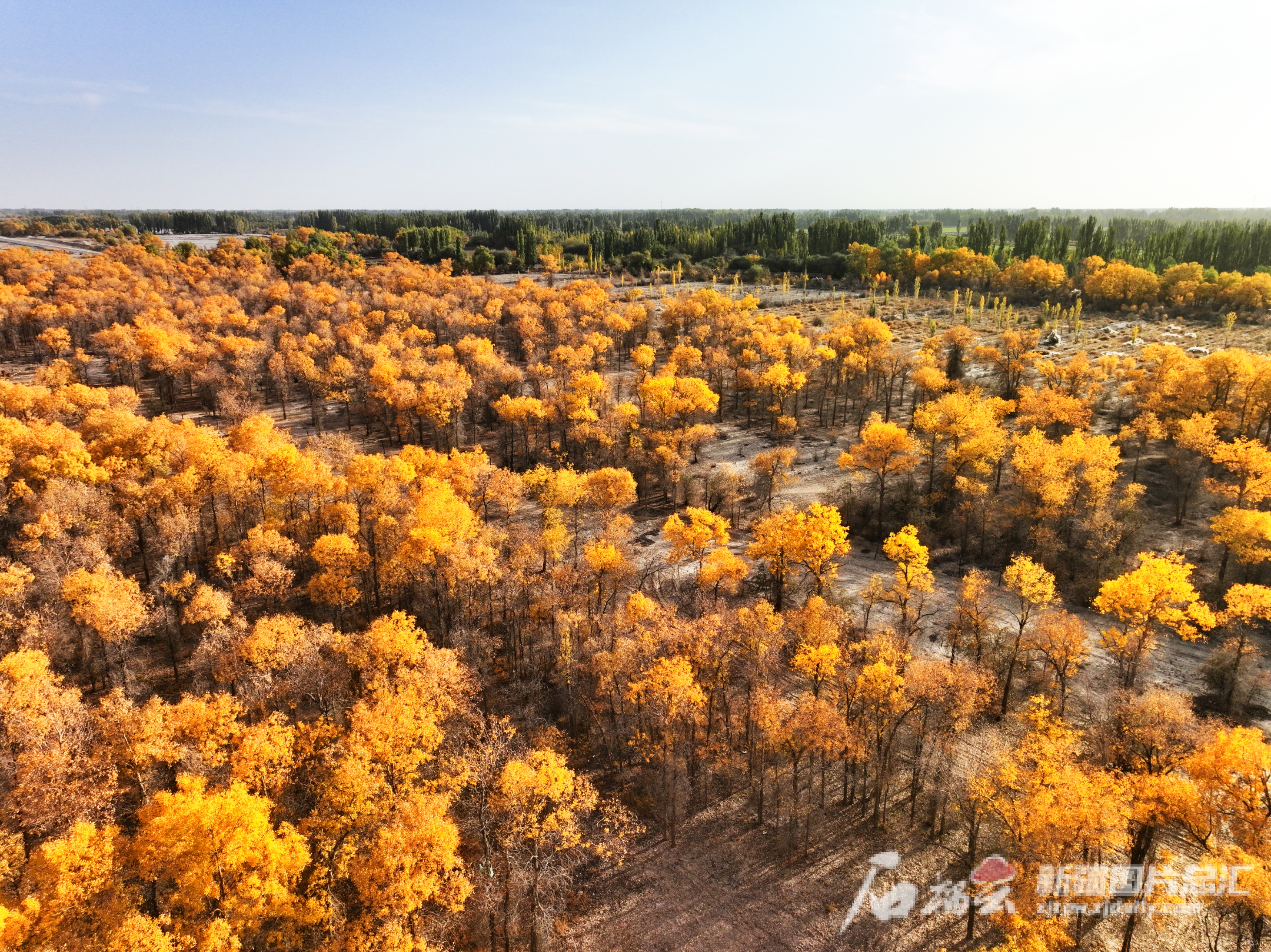 尉犁县罗布淖尔国家湿地公园秋色(11月2日无人机摄)。深秋时节,尉犁县境内的百万亩胡杨林进入最佳观赏期,金色胡杨与起伏连绵的沙海、蜿蜒流淌的塔里木河相映生辉,构成一幅绚丽多彩的自然画卷。汪志鹏摄