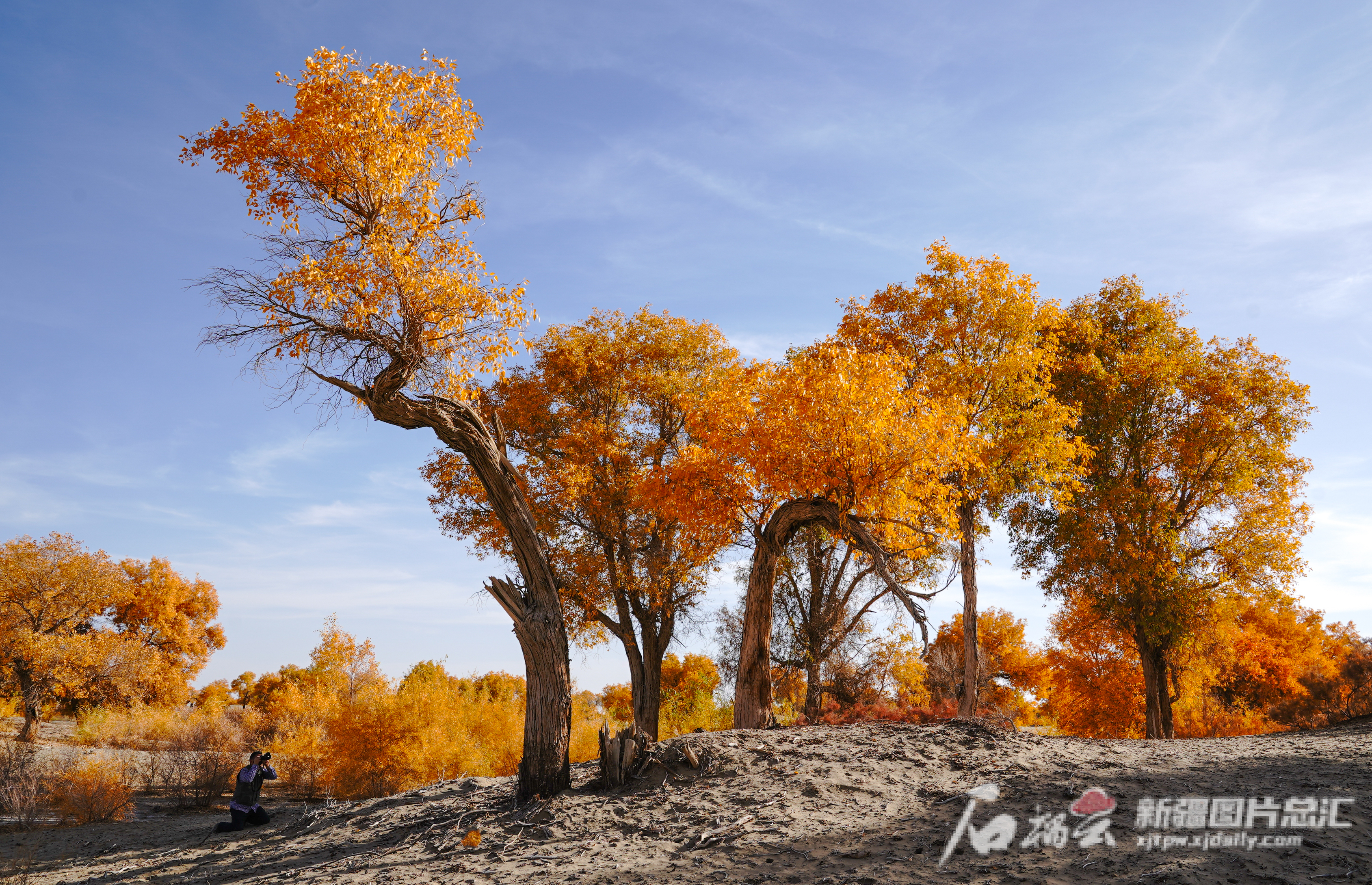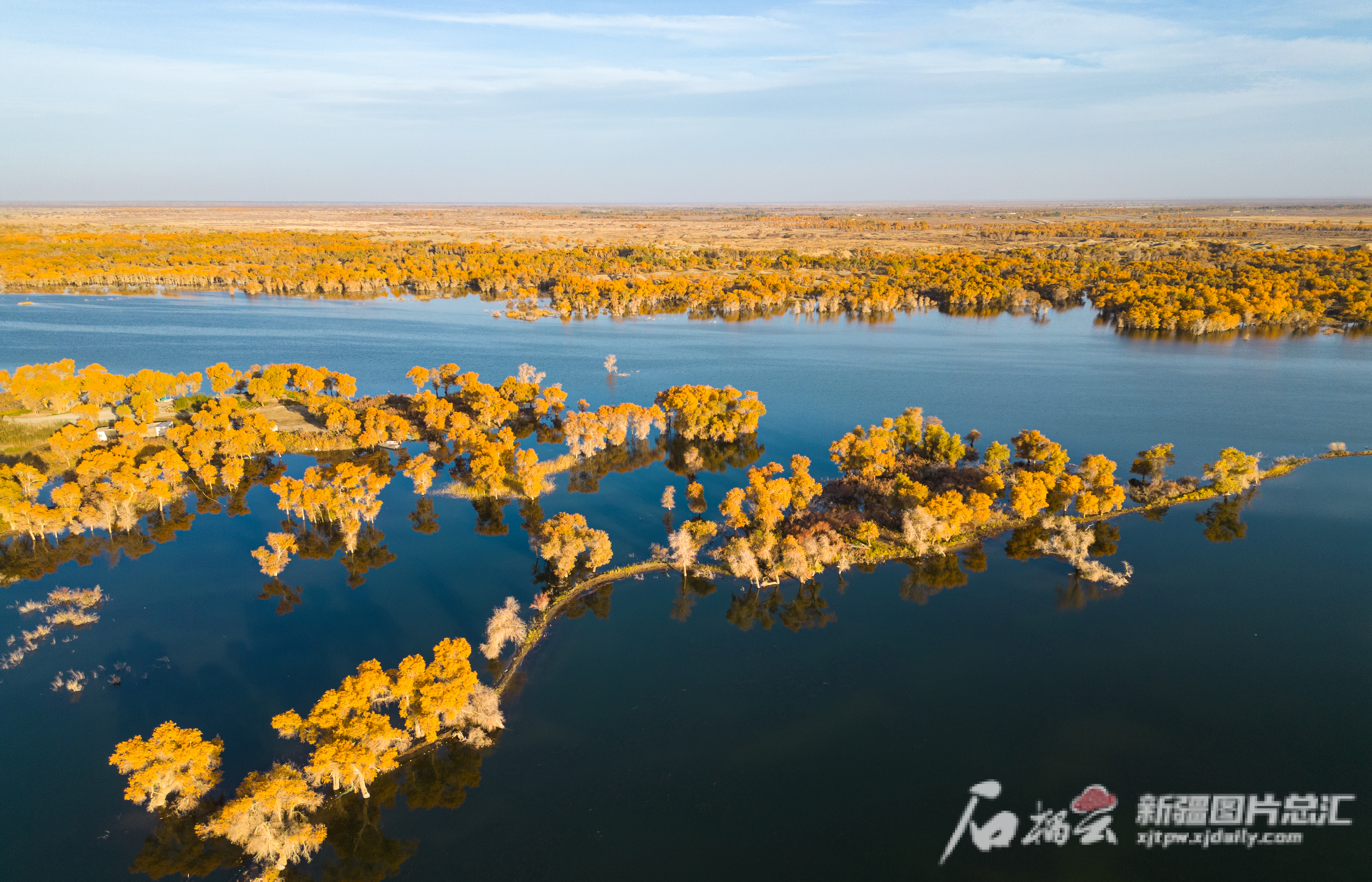 尉犁县罗布淖尔国家湿地公园里的胡杨披上“金装”(10月30日摄)。汪志鹏摄